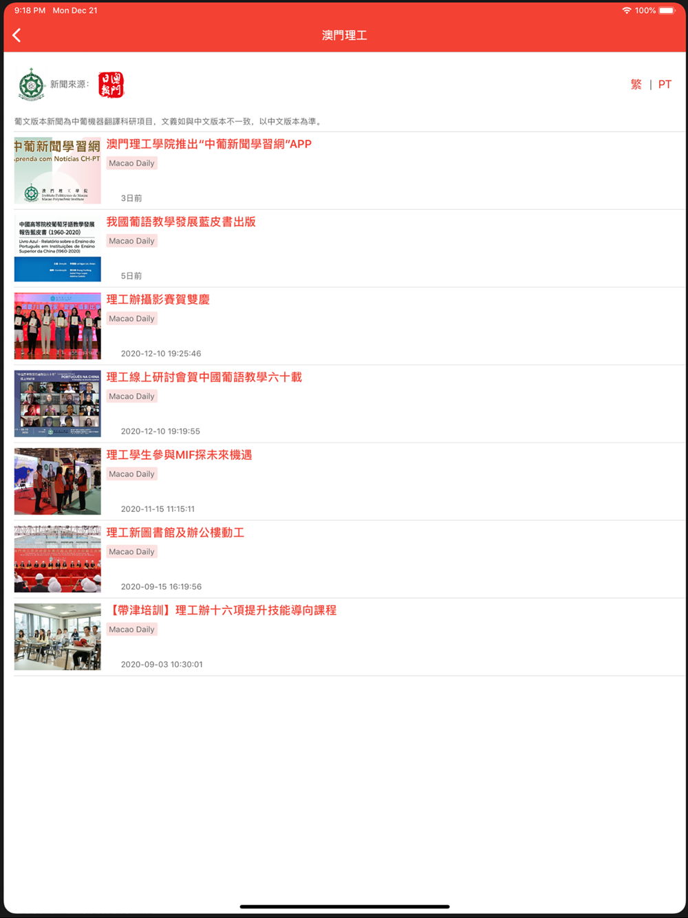 "Chinese-Portuguese News Learning App" is a scientific research project of the "Engineering Research Centre of Applied Technology on Machine Translation and Artificial Intelligence, Ministry of Education" of the Macao Polytechnic University. The App provides learning resources that enable people from Macao, China, and other countries to learn Portuguese, and people from Portuguese-speaking countries to learn Chinese. The content of the news column is divided into "local news", "China news" and "world news". The Chinese news source from Macao Daily.