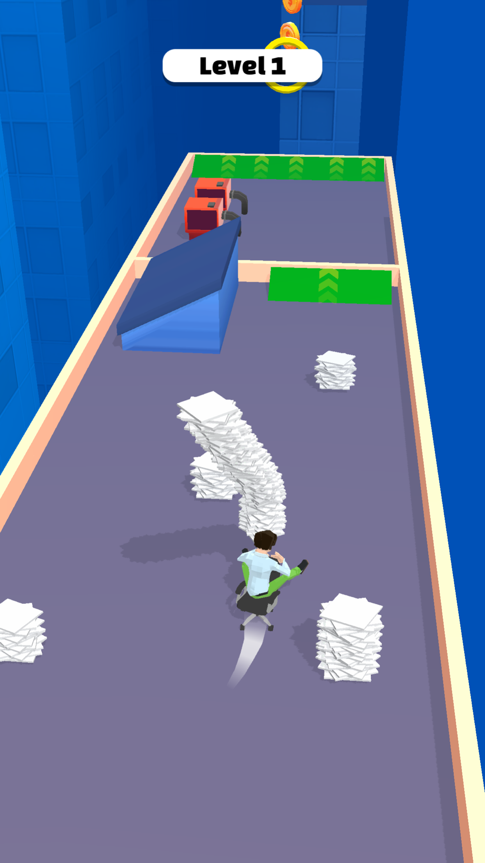Stack as many office papers as you can while you ride through the building. But try not to hit any obstacles and lose your precious stack.