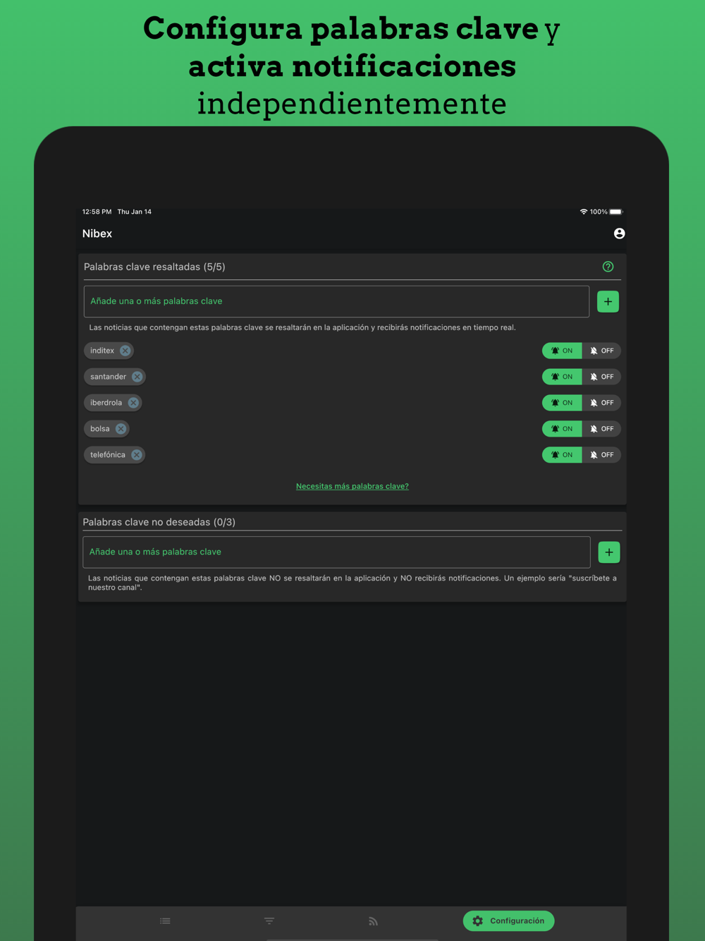 Puedes activar/desactivar los proveedores de noticias o activar/desactivar las notificaciones para cualquier palabra clave.