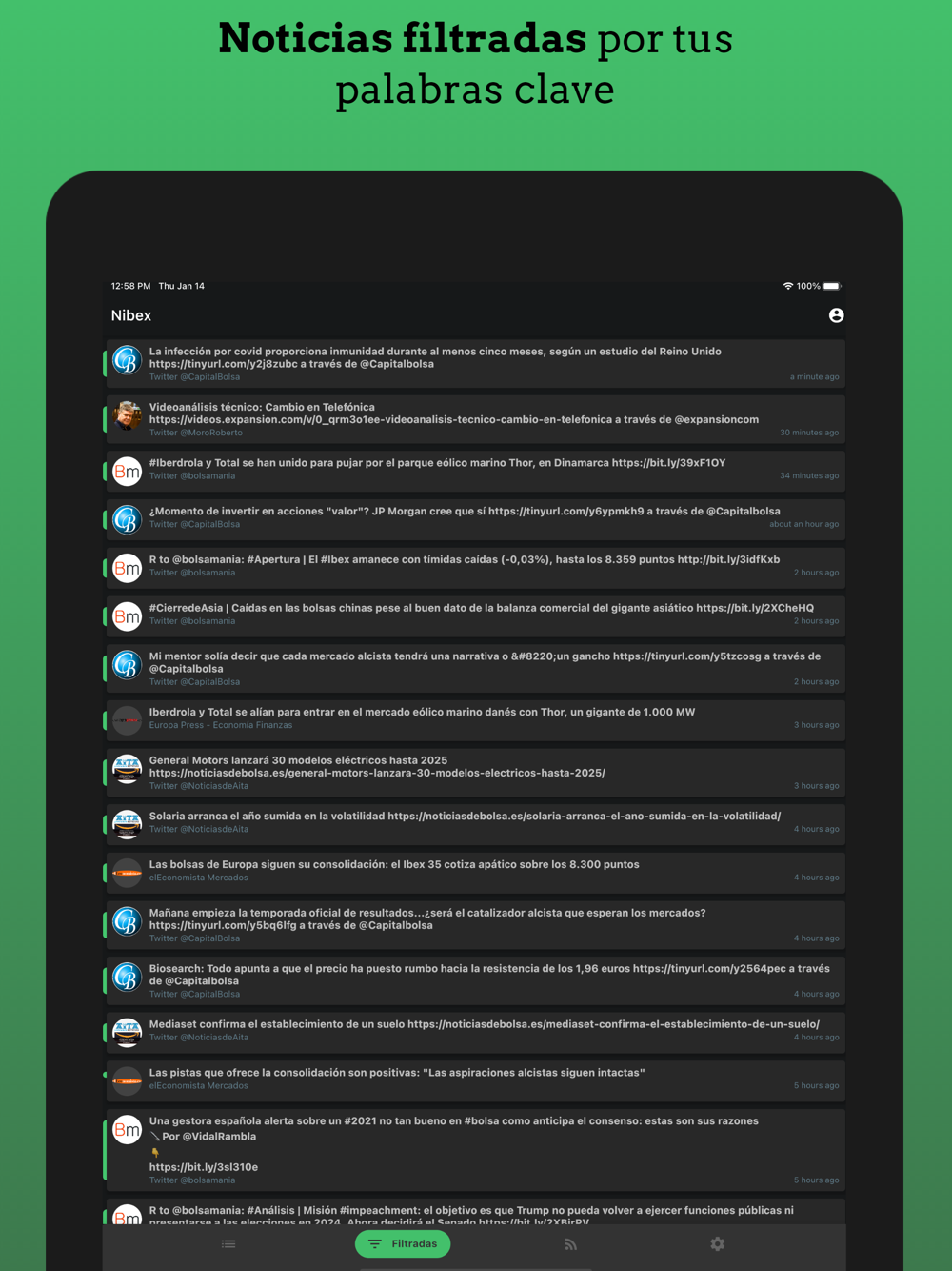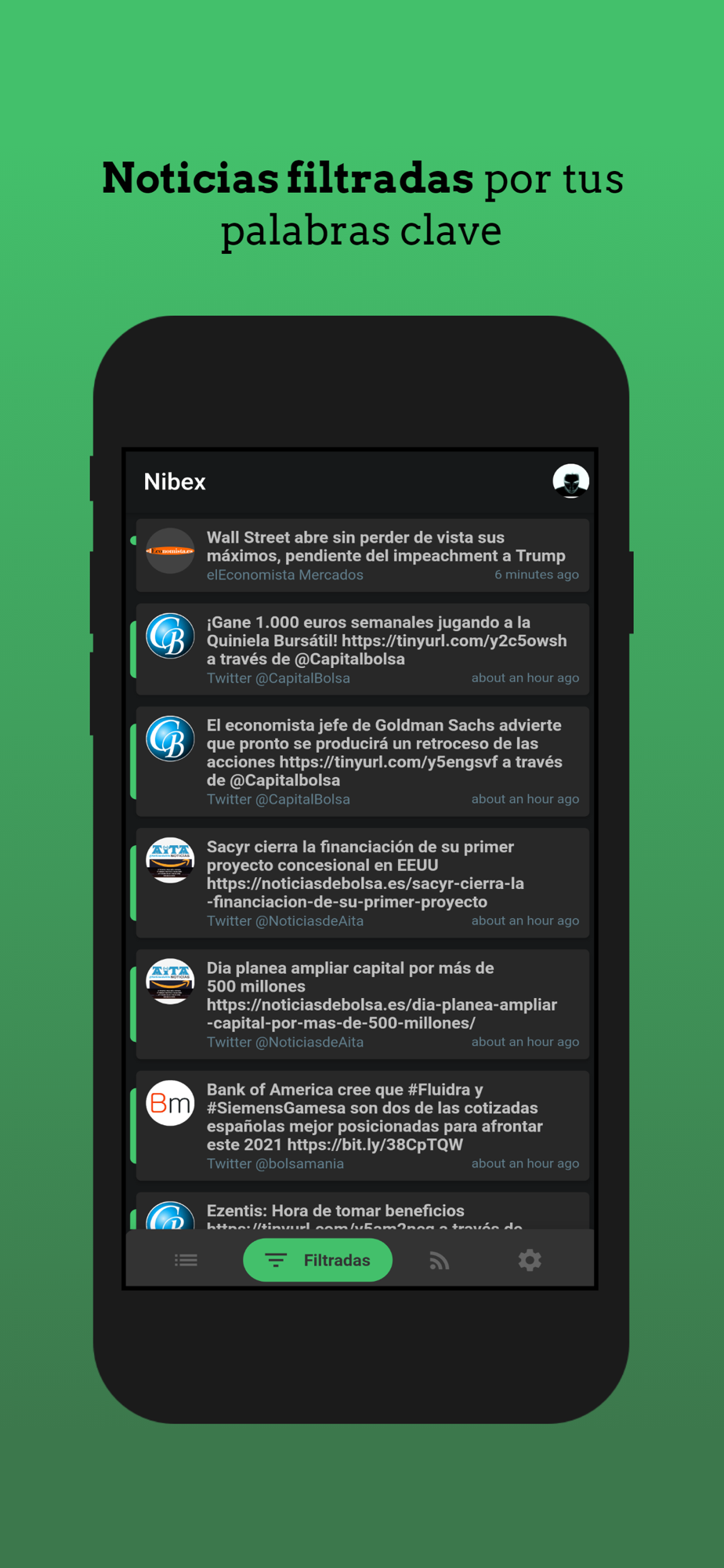 ¿Por qué usar esta aplicación en lugar de twitter o cualquier otro agregador de noticias? Sencillo, porque las personas influyentes o analistas de twitter pueden hablar de muchos temas diferentes que pueden no interesarte. Al configurar palabras clave, sólo recibirás notificaciones de noticias que contengan esas palabras.
