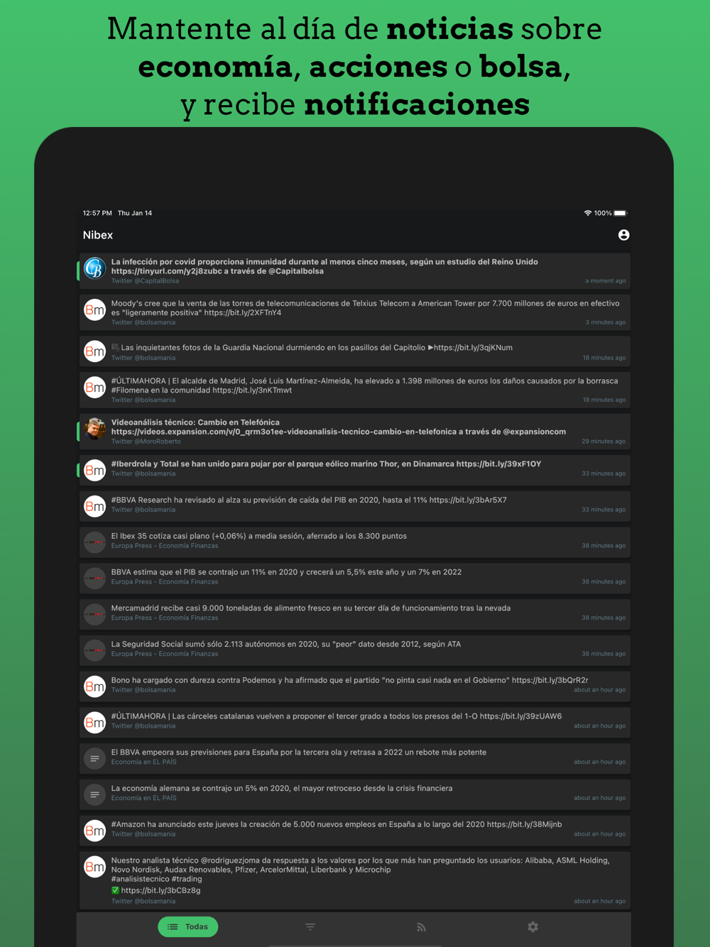 No necesitas tener ningún widget de noticias, la aplicación te enviará notificaciones en tiempo real, manteniéndote informado de todas las noticias financieras del mercado español o la bolsa (ibex 35), siempre teniendo en cuenta tus intereses definidos en las palabras clave. Empieza a recibir notificaciones hoy ahorrándote tiempo en la búsqueda de noticias interesantes.