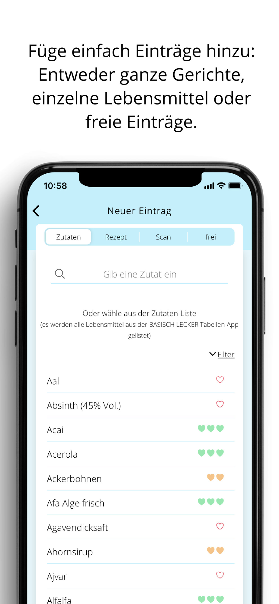 Jetzt ist es endlich möglich, dass du deine basischen Ernährungsgewohnheiten tracken kannst. Der Säure-Basen-Rechner ermöglicht dir, ganz einfach einzelne Lebensmittel und Rezepte (von BASISCH LECKER) zu erfassen und deiner Tagesbilanz hinzuzufügen. Du kannst auch Produkte mit Strichcode scannen - erfährst dann, wie diese verstoffwechselt werden (basisch, neutral, guter oder schlechter Säurebildner) und kannst sie ebenfalls hinzufügen. Du bist Profi und weißt, wie dein Essen verstoffwechselt wird? Dann nutze den freien Eintrag und sei noch schneller in der Erfassung.