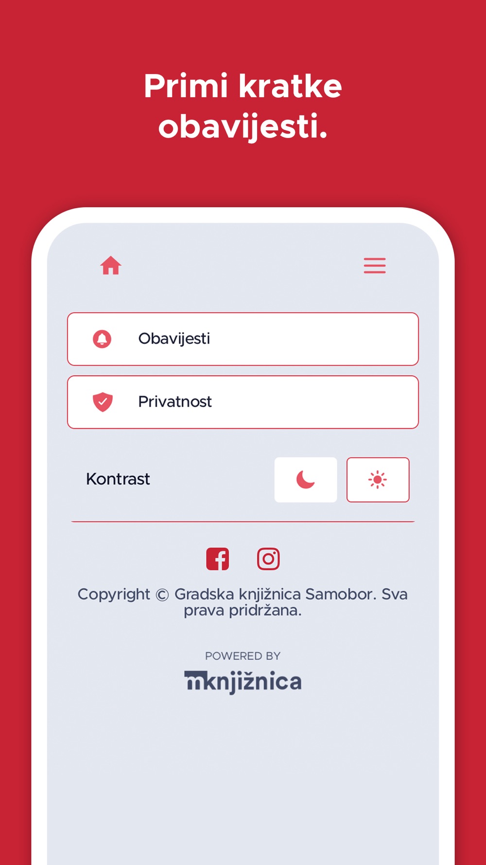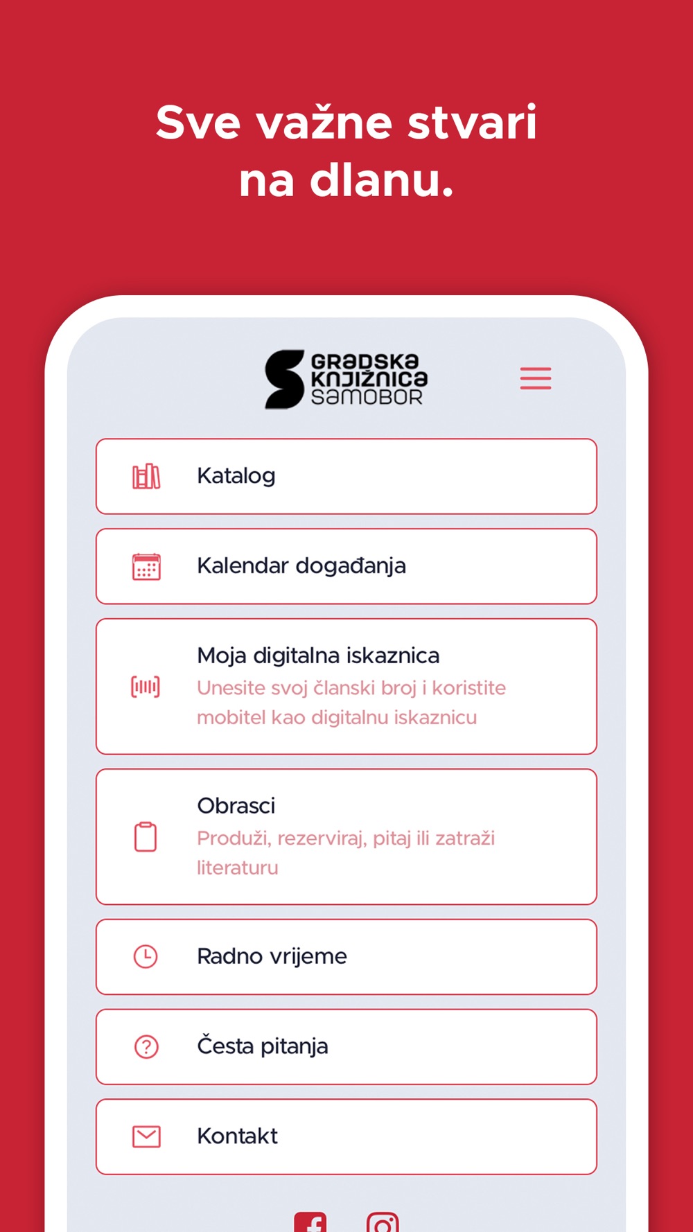 Aplikacija je namijenjena korisnicima Gradske knjižnice Samobor uz pomoć koje korisnici mogu pretražiti e-katalog knjižnice, pregledati kalendar događanja u knjižnici, generirati svoj korisnički broj u barkod, produžiti posudbu građe, rezervirati građu, provjeriti da li knjižnica posjeduje primjerak neke građe ili zatražiti literaturu za seminarski rad. Unutar aplikacije nalaze se i Radno vrijeme knjižnice, odgovori na Česta pitanja, kontakt podaci svih odjela i službi knjižnice te poveznice na društvene mreže.
