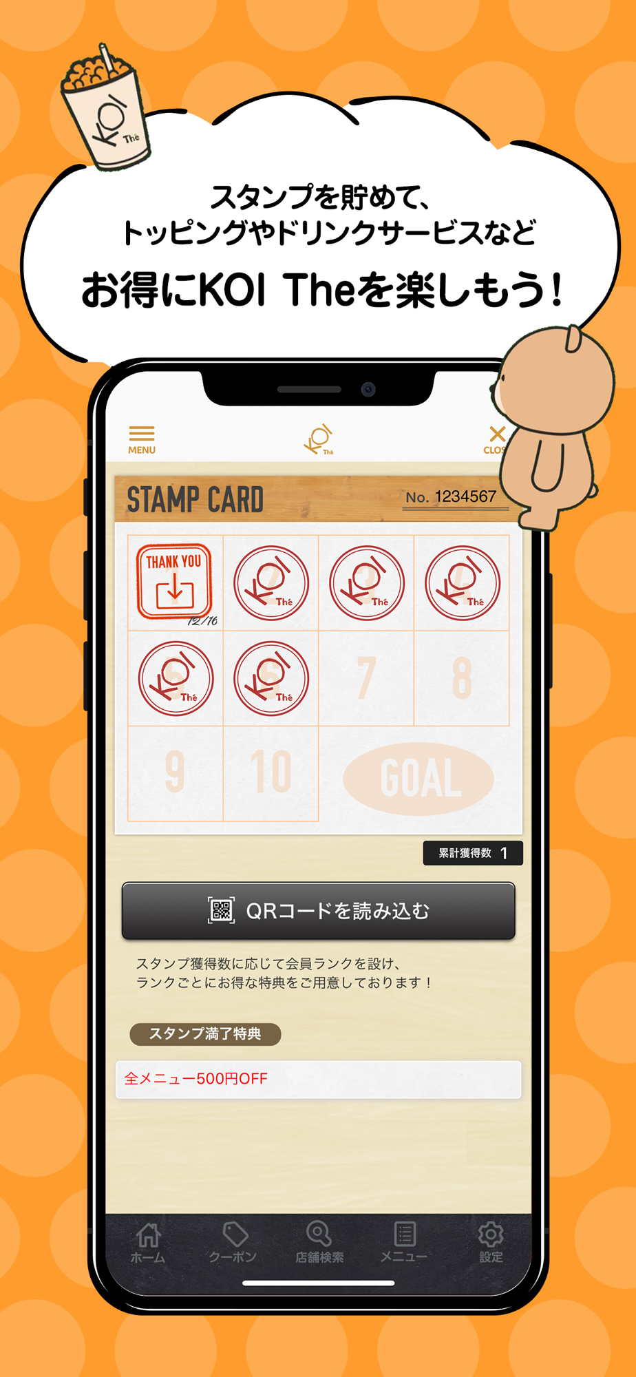 スタンプを貯めると、トッピングやドリンクのサービスを受けられます。