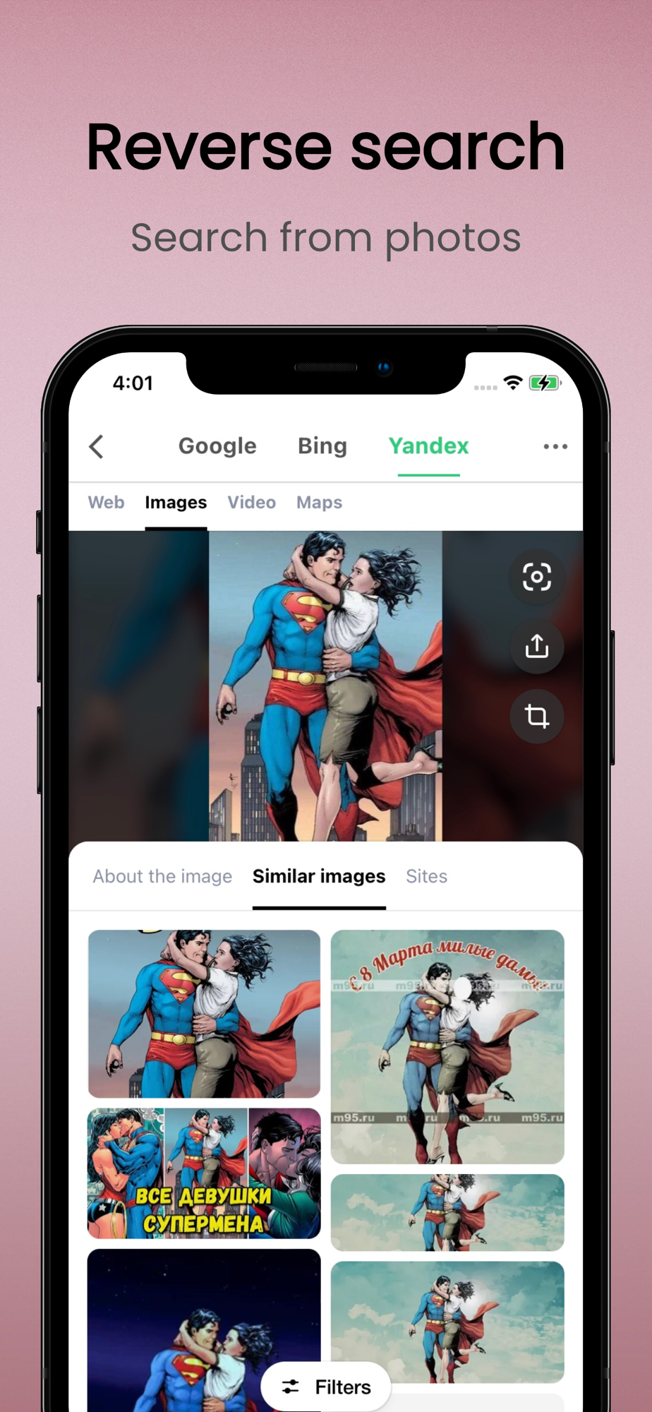 Search By Image helps you quickly discover visually similar images from around the web. Upload a photograph from your mobile to Search By Images and it will show you related images used on other websites and also different sizes of the same photo almost instantly.