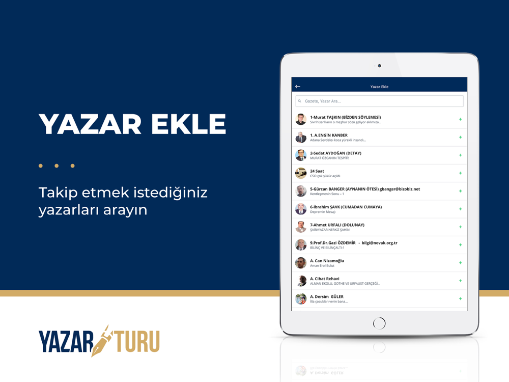 Yazar Turu, tüm köşe yazarlarının yazılarının tek bir uygulamada toplandığı IOS cihazlara duyarlı bir uygulamadır.
