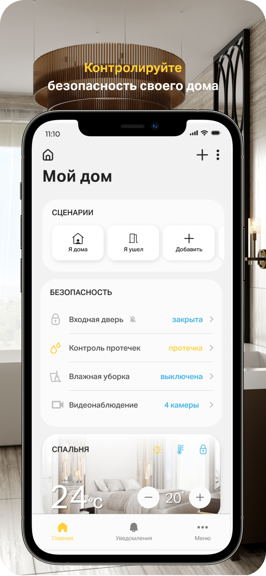 Датчики протечек, пожарные и охранные системы всегда начеку: в случае критической ситуации система автоматически примет защитные меры, а вы мгновенно получите уведомление.