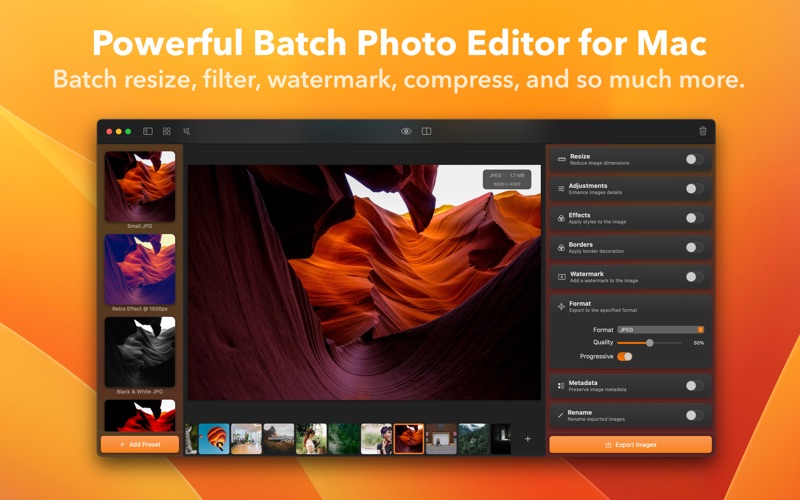 - Apply gorgeous photo filters to multiple images.