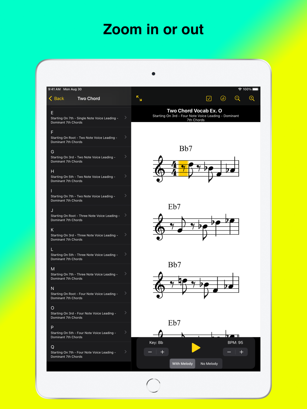 The app includes range specific transpositions in all 12 keys for tenor, alto & baritone sax, clarinet, flute, trumpet, trombone, bass, piano, vibes & guitar. All exercises have an iReal Pro backing track, the user can play along with the in-app audio or open the backing track in iReal Pro with one tap.