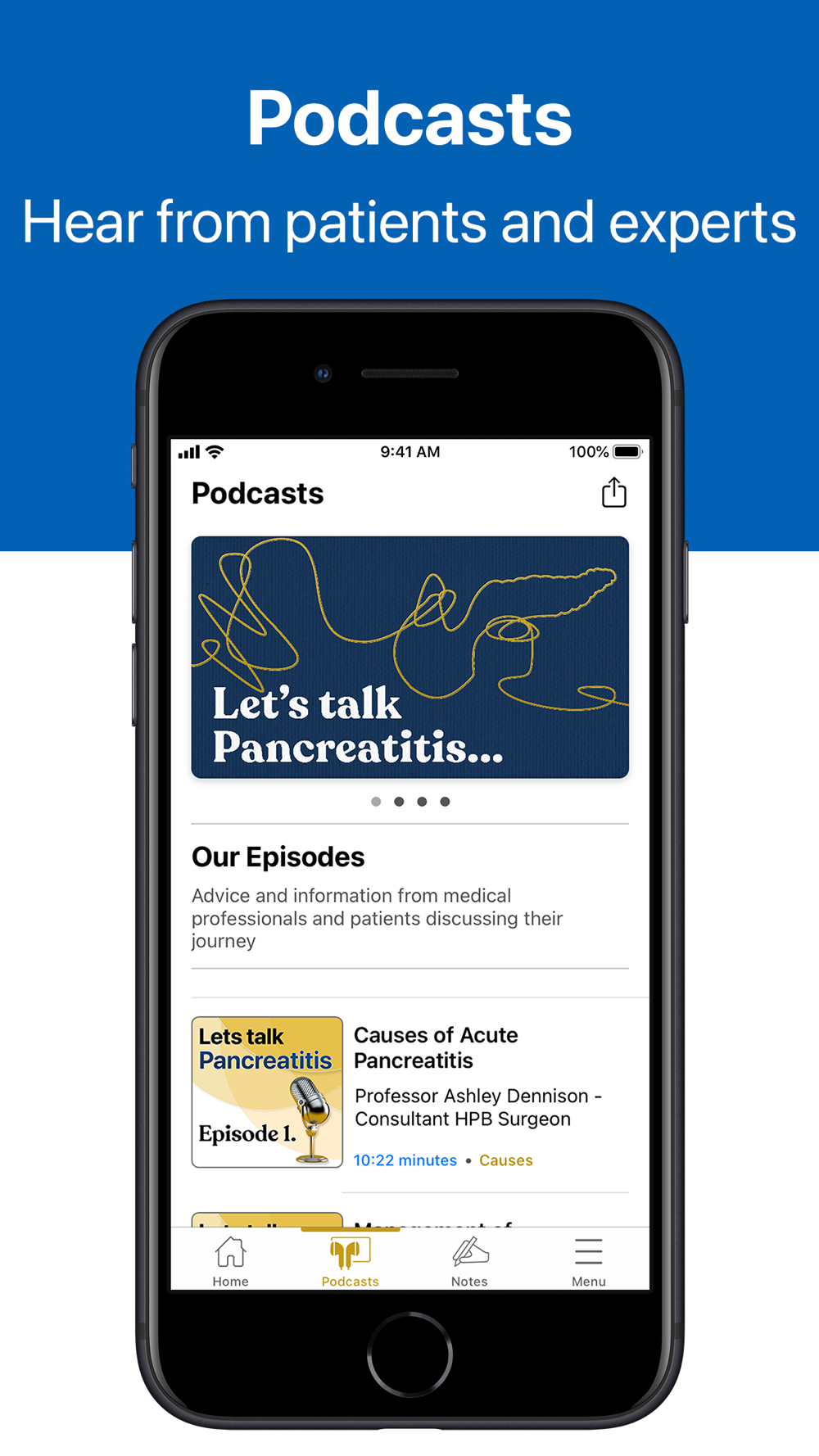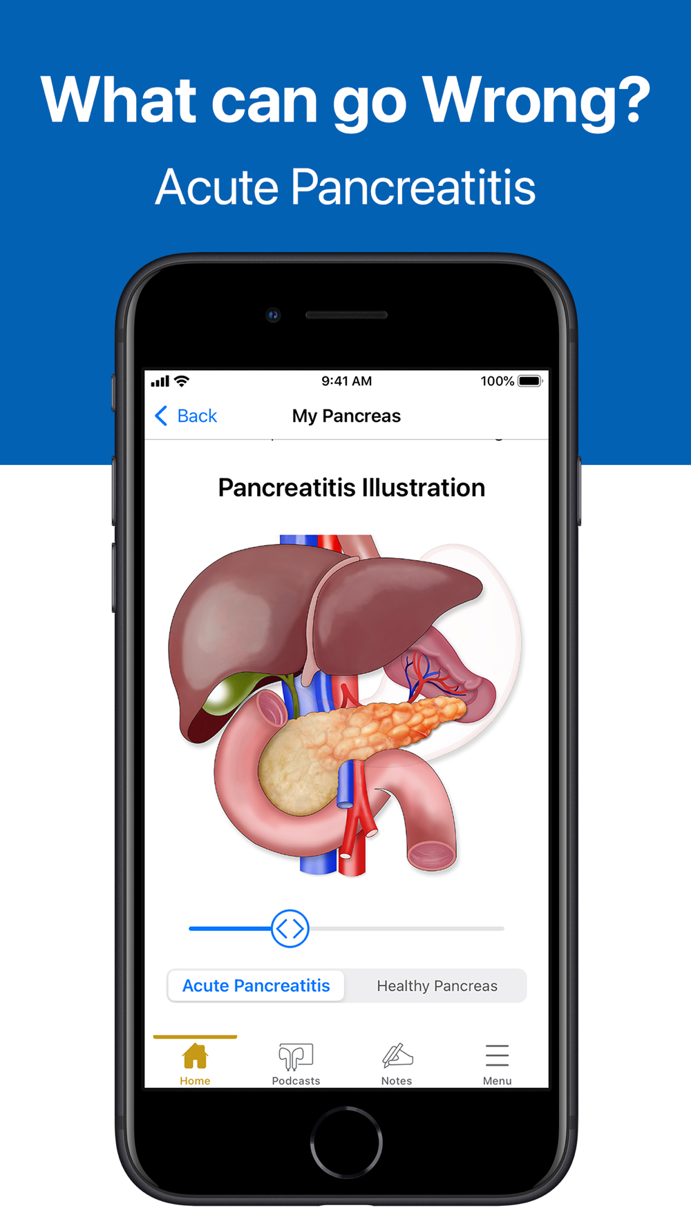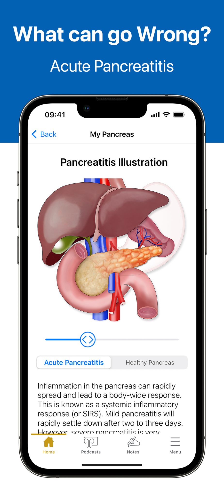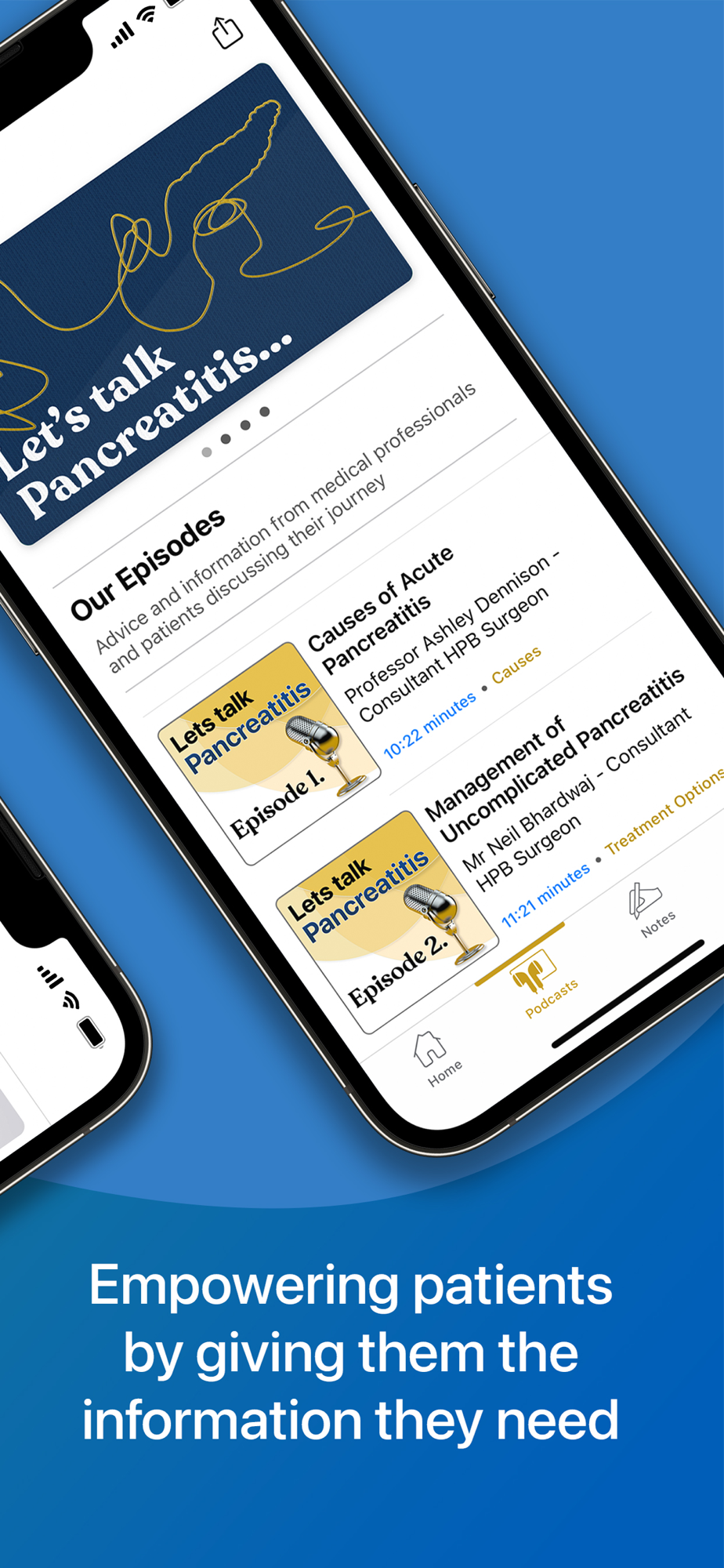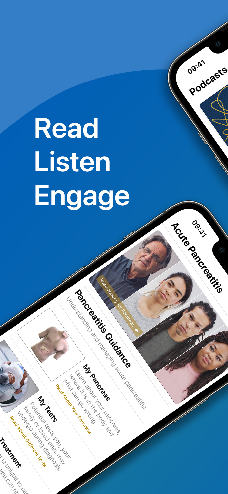 My Acute Pancreatitis is an educational resource for NHS patients their family members, carers, and friends to learn about Pancreatitis. The app uses images videos and podcasts to guide a patient through their journey, educates them on the pancreas and its function and what can possibly go wrong. The app is split into two sections. An educational section where we discuss the pancreas, tests you may undergo during diagnosis, treatment options and available helpful guidance as well as a section for writing notes. Second the podcast section where you can listen to patients and medical experts discuss acute pancreatitis and their journeys. My Acute Pancreatitis aims to empower patients by giving them the information they need.