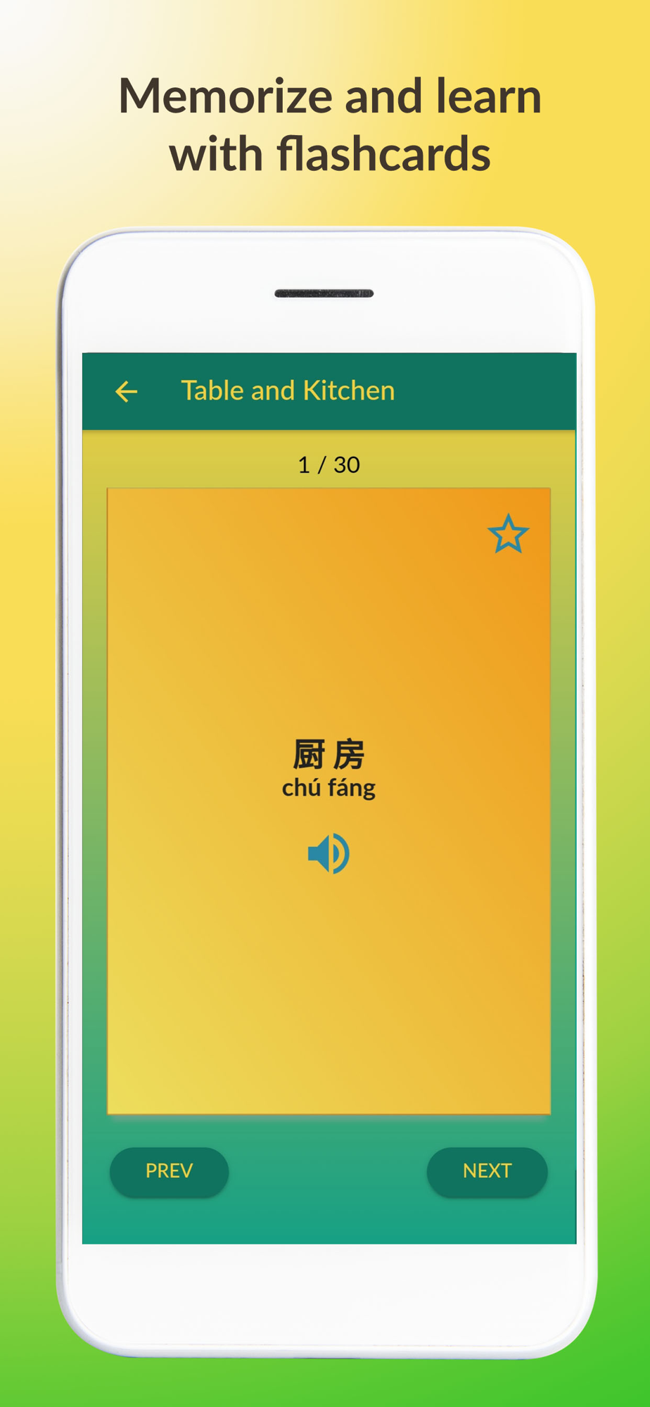 Learn using flashcards with pinyin, Chinese characters, English and audio clips recorded by a native speaker (no dull robot voice!).