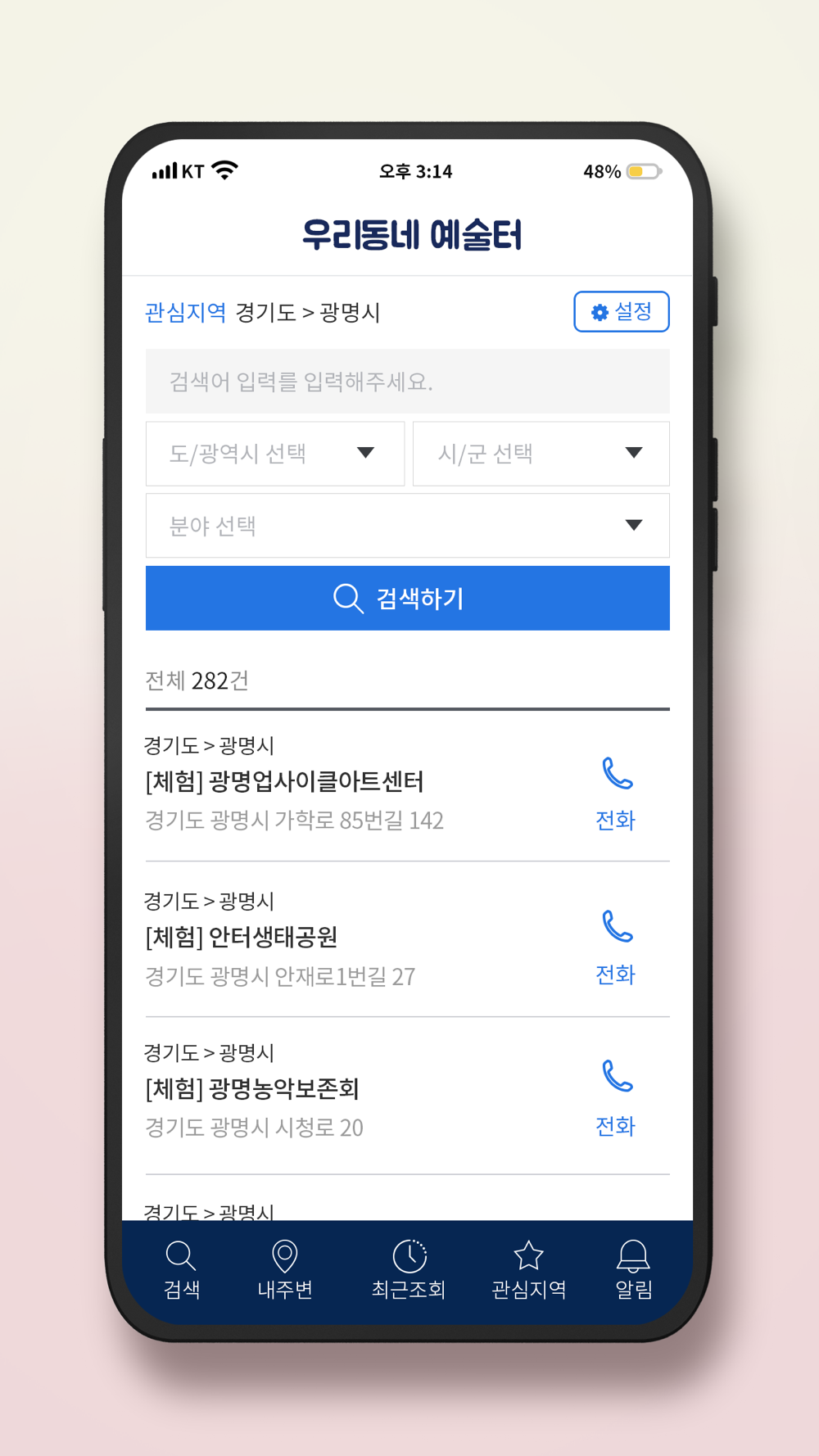 우리동네예술터 앱은 전국에 있는 문화기반시설 / 예술 활동을 위한 지역 정보 / 각종 관련 자원등을 지역 구분 및 정보 구분 별로 사용자가 쉽게 검색하고, 정보를 확인하며 주변의 문화시설을 확인할 수 있는 주요기능을 제공합니다.