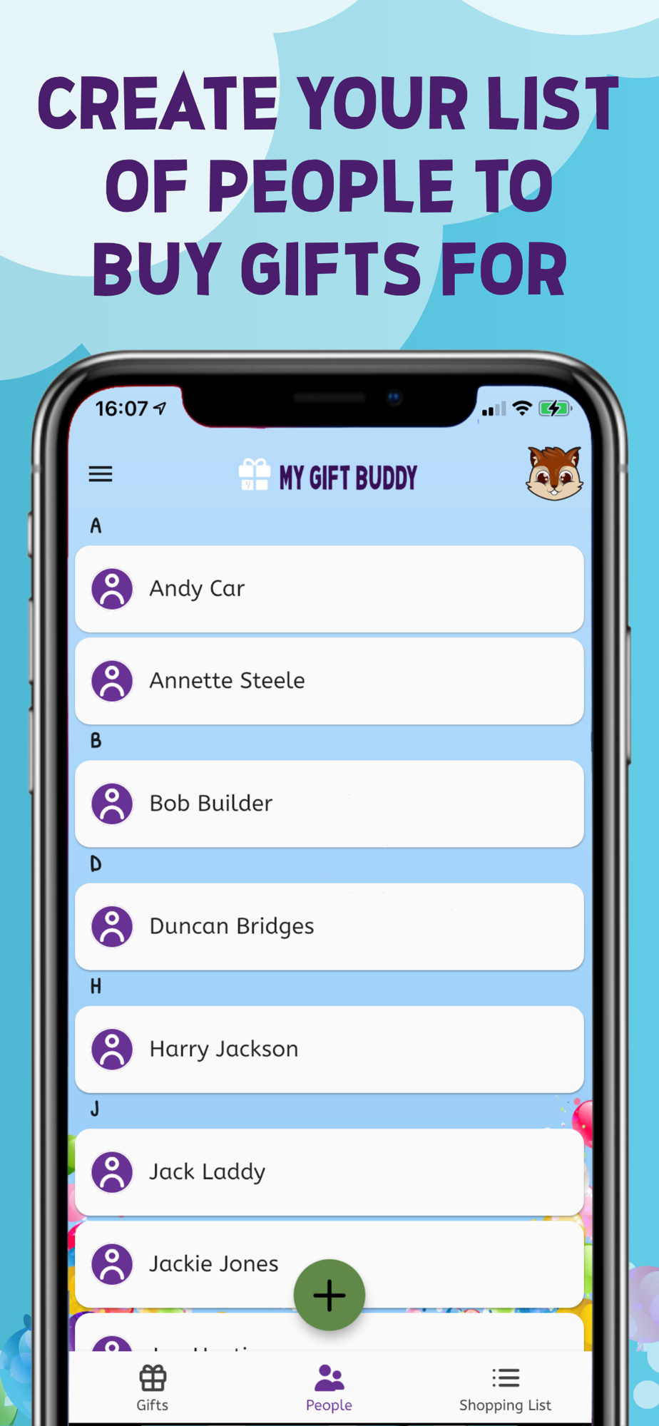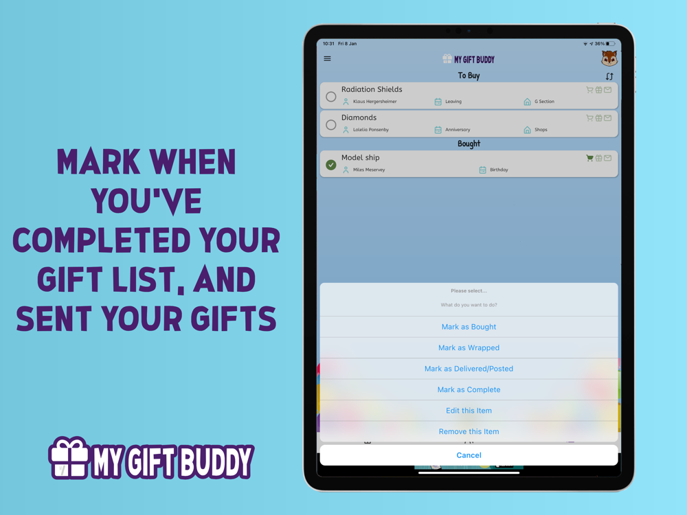 My Gift Buddy helps you organise who you want to buy presents for throughout the year. You can add your own gift ideas, or contact people through the app to find out what they want they want!