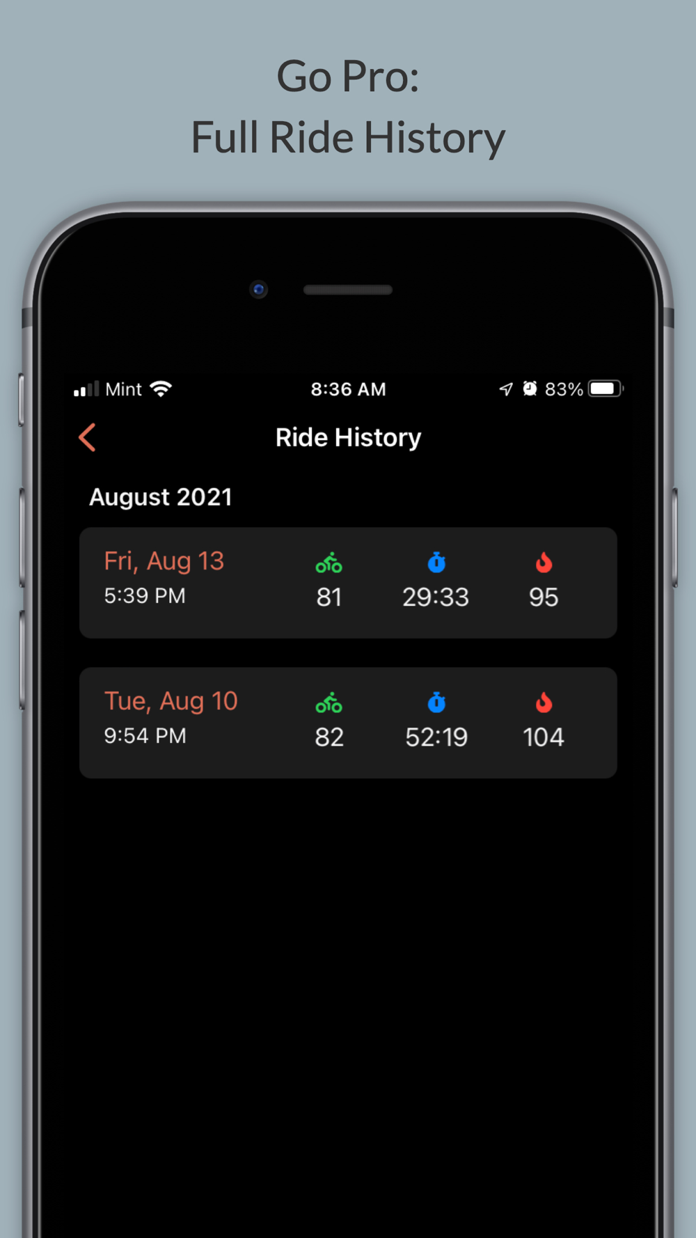 Upgrade to Pro to unlock full ride history with monthly summaries, stats, and charts. On top of that there are a lot of display settings with custom themes and the option to display average cadence, max cadence, elapsed time, and total rotations during your ride. You can even backup your ride data and re-import it on new devices.