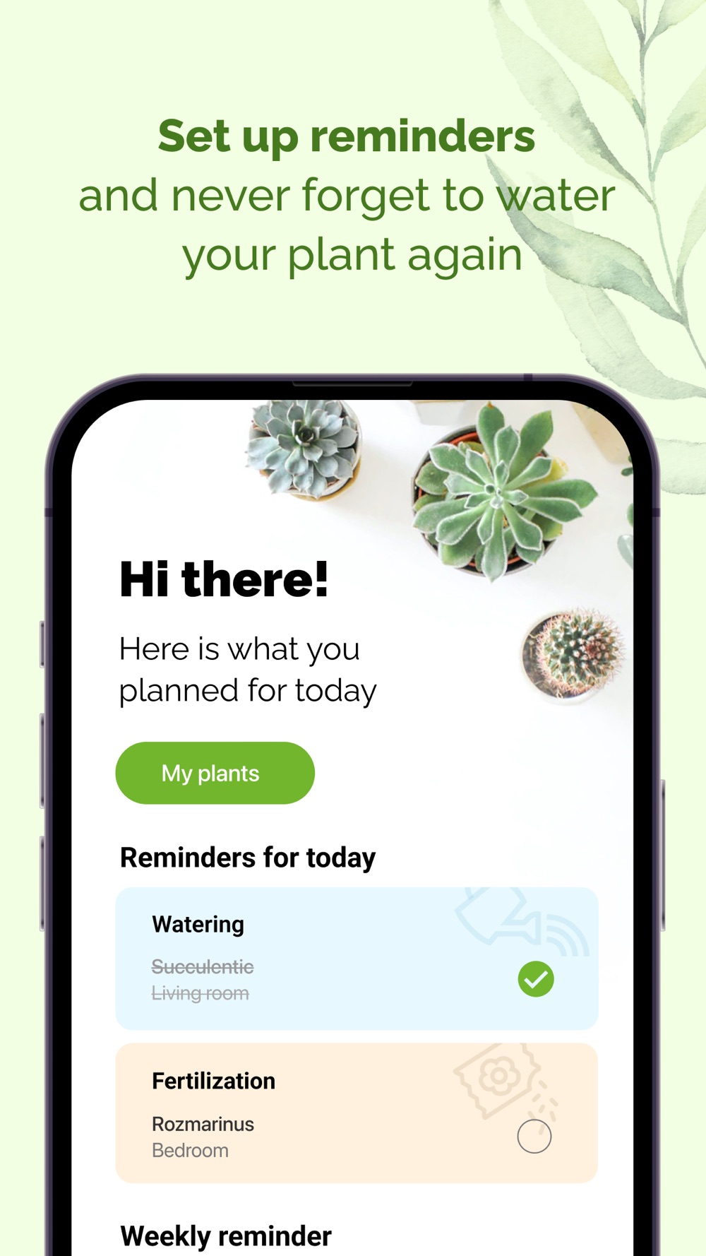 – Create profiles for your plants, add a name, room, reminders, and photos