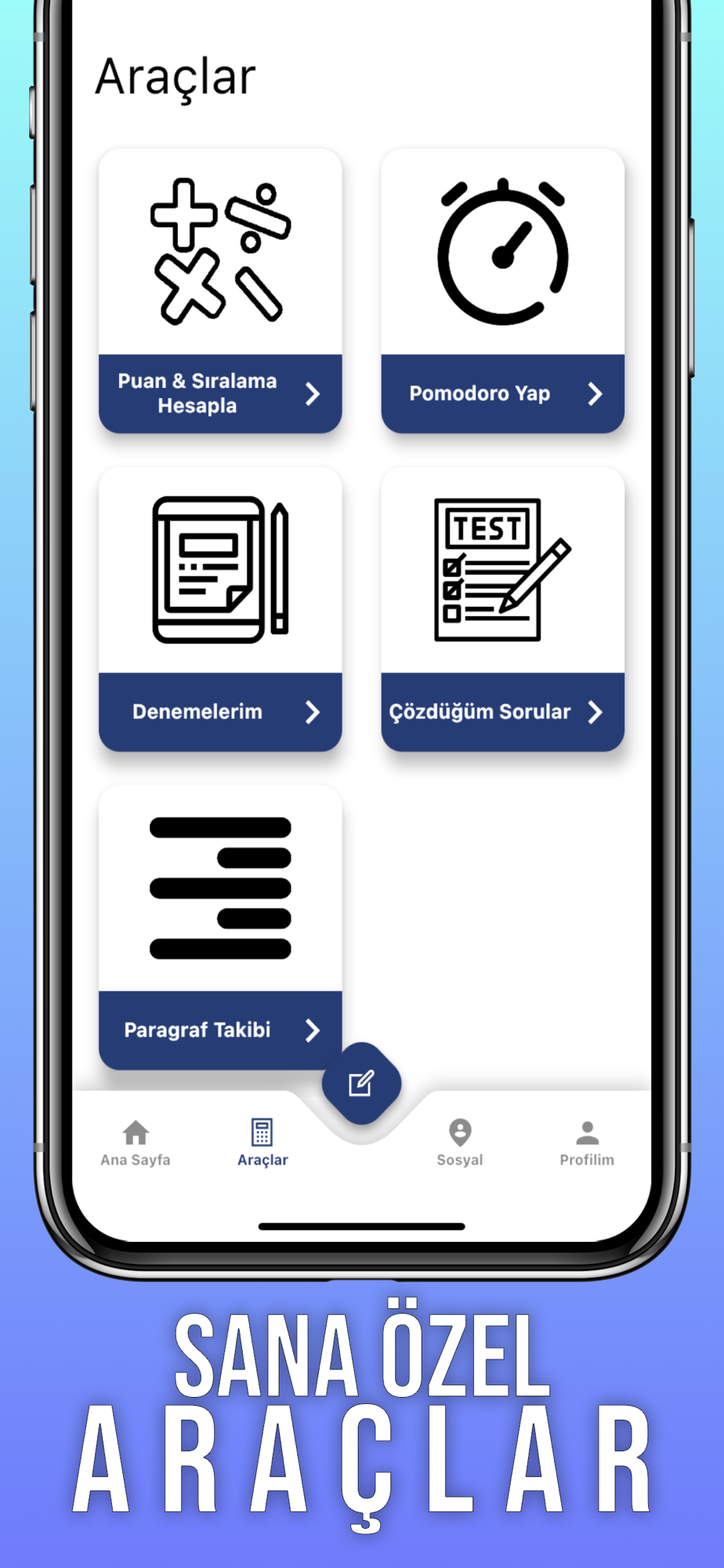 İster sana özel pomodoro yap, ister TYT denemeni gir; ÖSYM baz alınmış tahmini puan ve sıralamanı öğren, ister sorularını ekle, ister denemelerine bak, ister paragraf bilgilerine bak. Araçların hepsi sana özel.