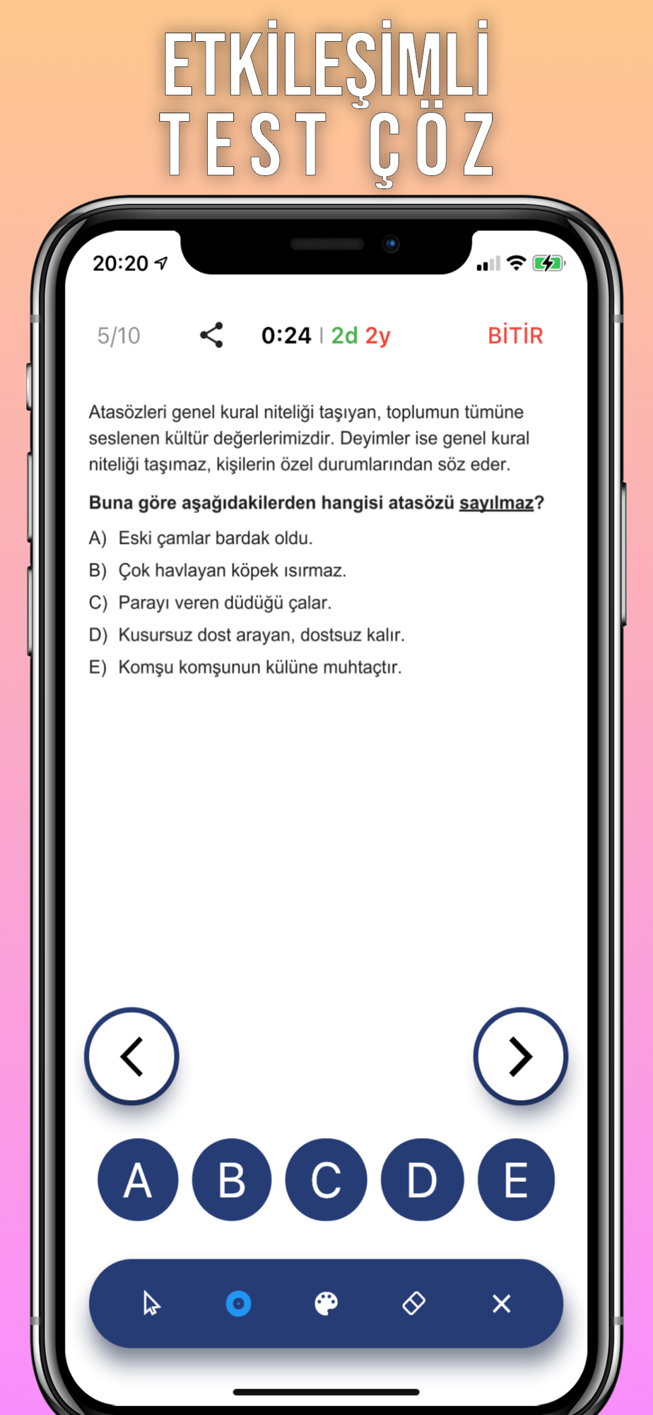 YKS Cepte ile 12500+ soru, 250+ konu ve onlarca ders seçeneği ile hem soru çözebilir, soru çözerken istediğin gibi yazabilir, silebilir, rengini/kalınlığını ayarlayabilir, paylaş butonu ile yapamadığın soruları WhatsApp'tan paylaşabilir ya da galerine kaydedebilirsin. Ayrıca hem konu anlatımlarını okuyabilir, hem de konu videolarını izleyebilirsin.