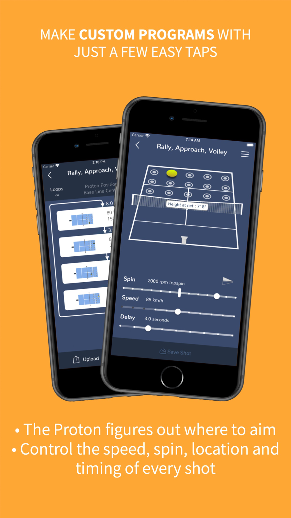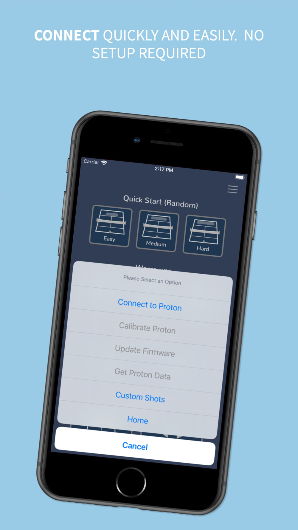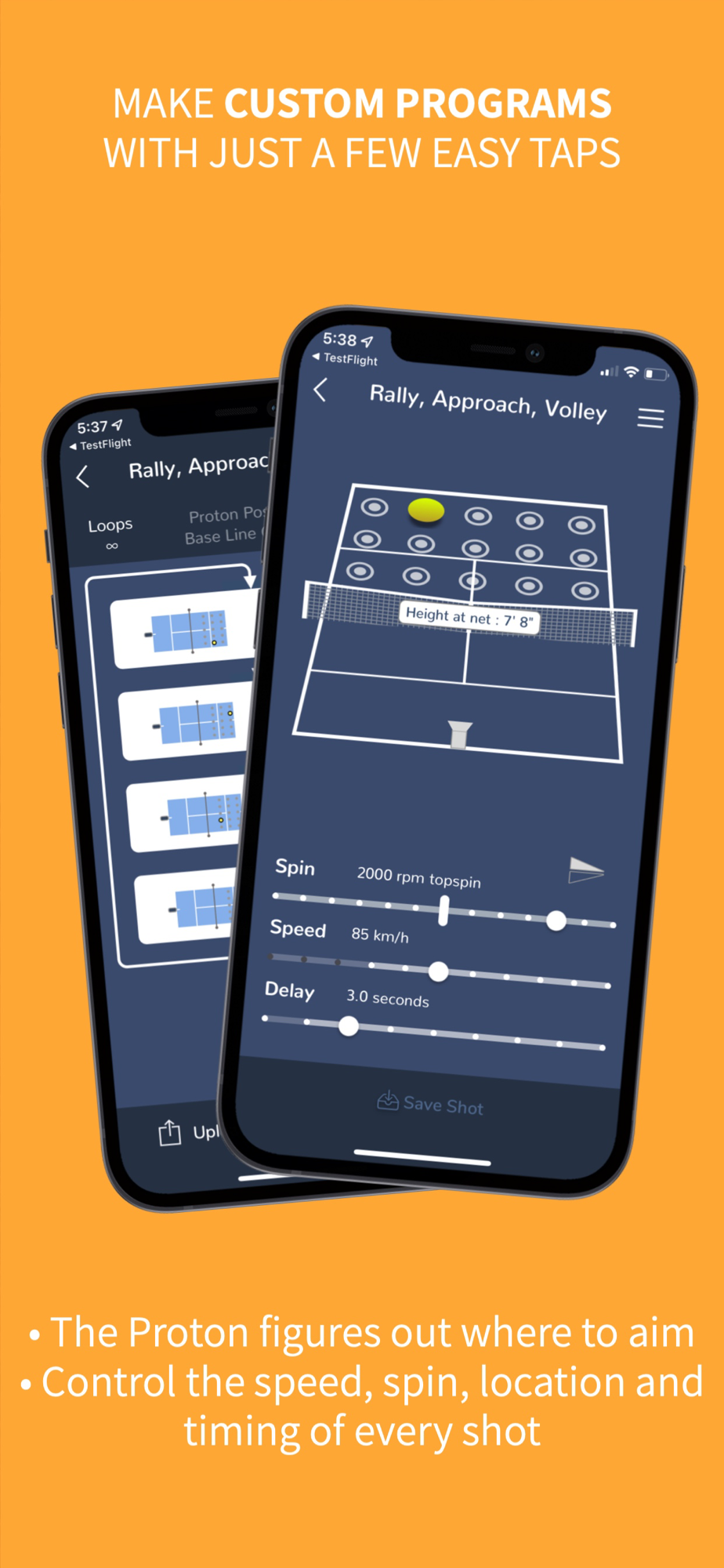Proton Control pairs wirelessly with your Proton to enable remote control and programing of your ball machine. Inside the phone app you can access built-in training routines and easily create your own custom shot sequences. The Apple Watch app allows control and execution of saved shot sequences without your phone. A Proton ball machine from Hydrogen Sports is required for use.