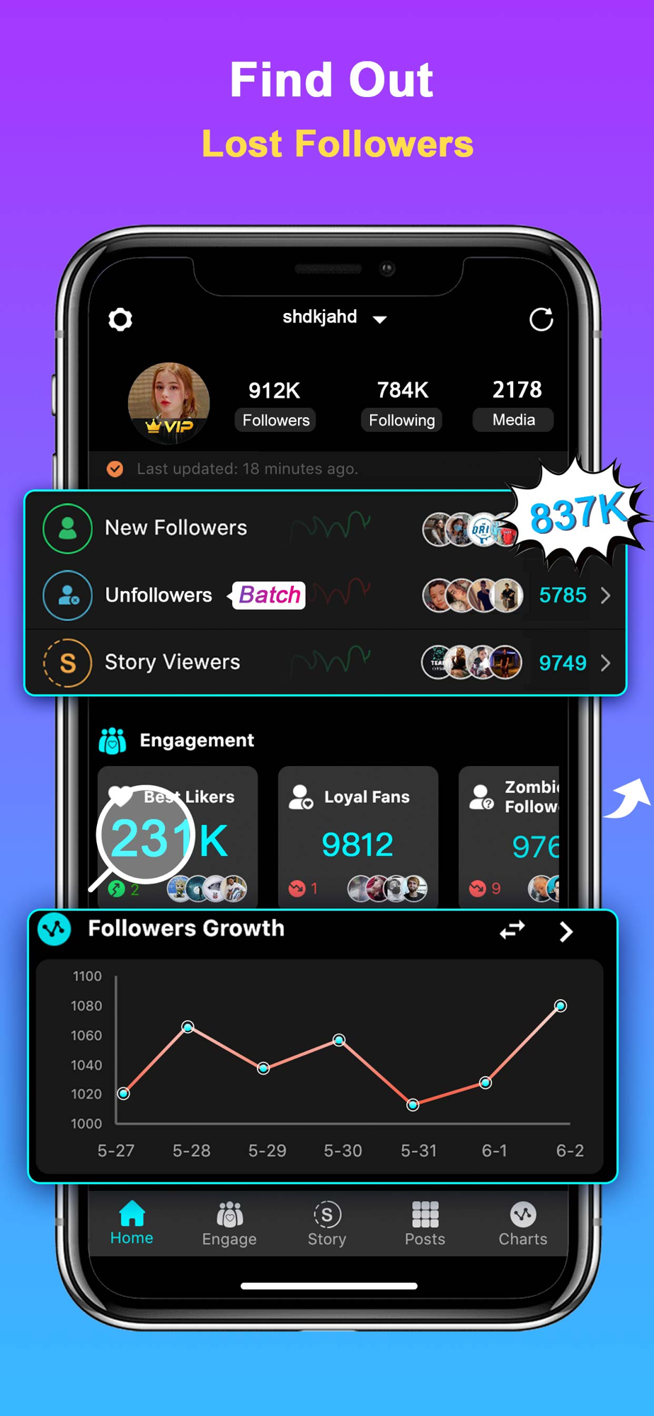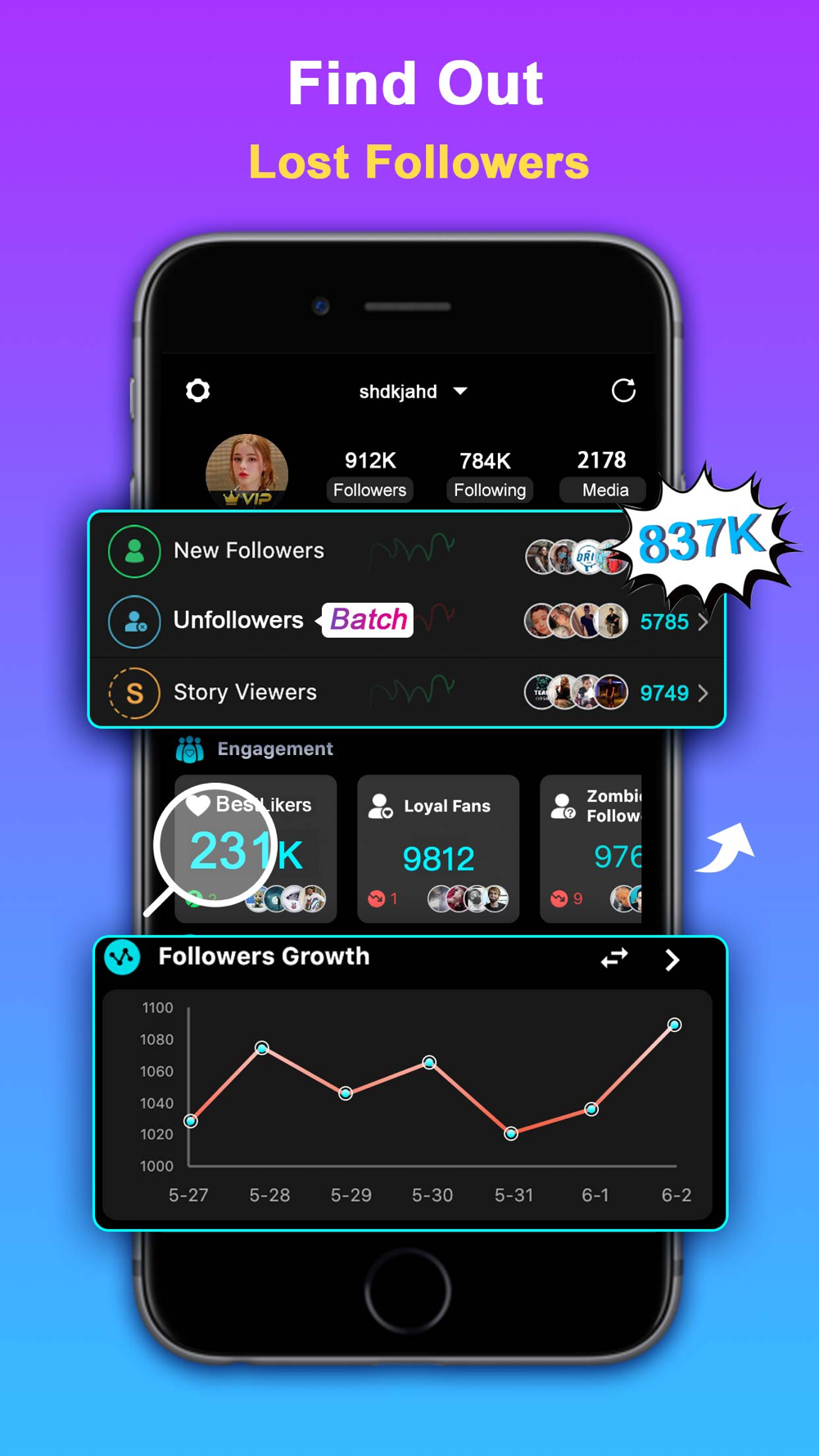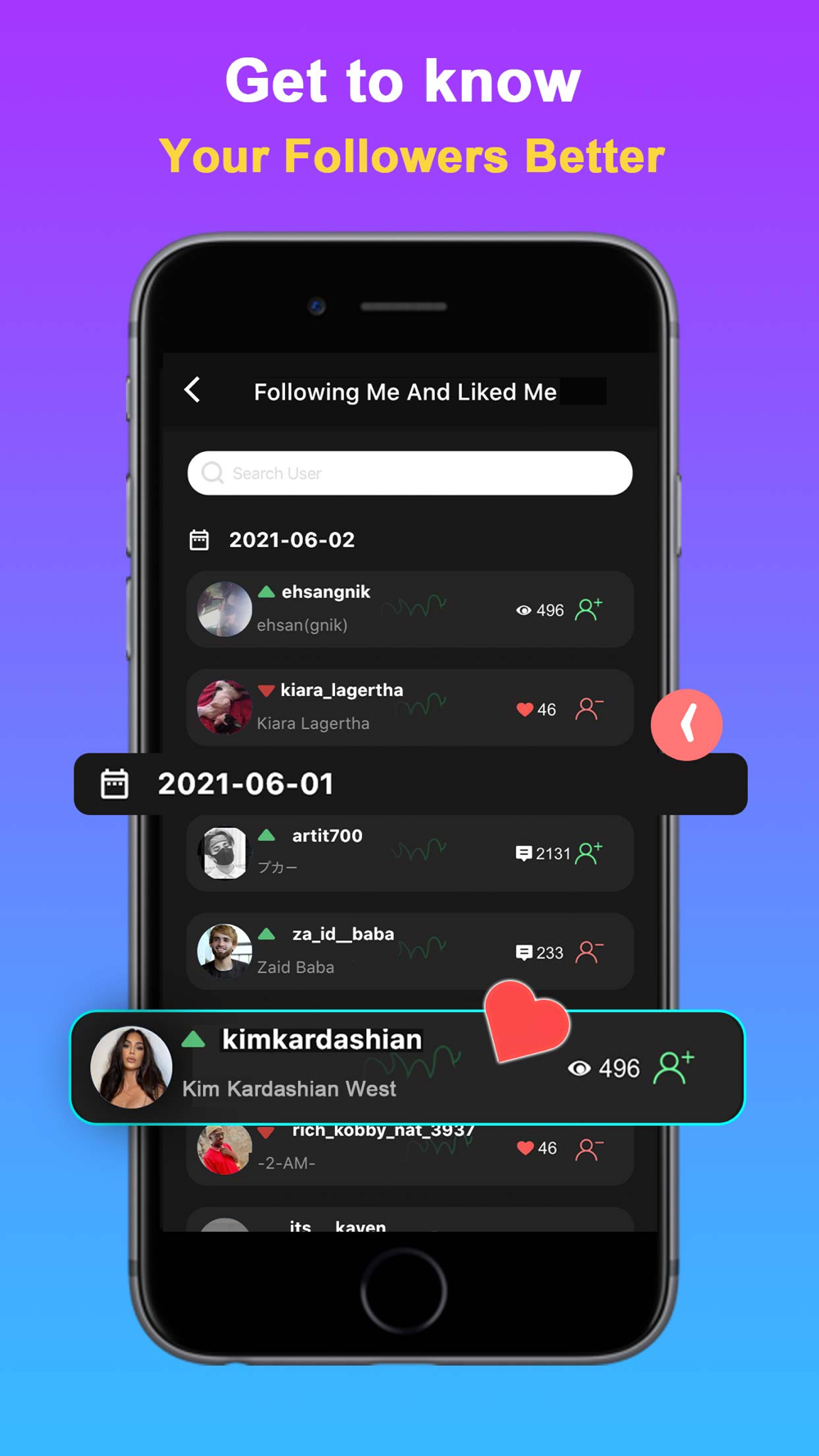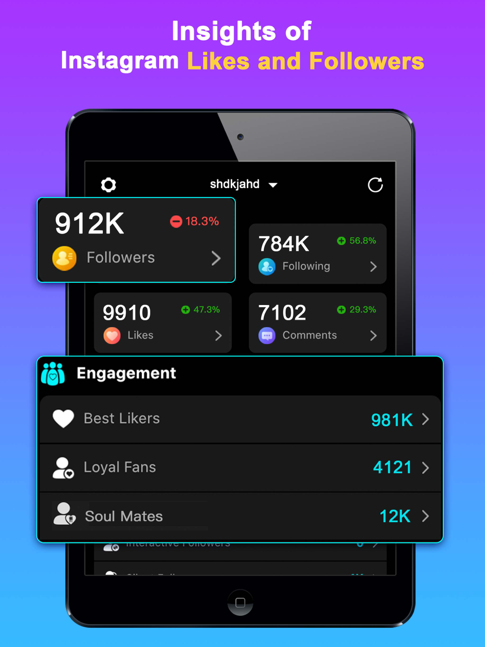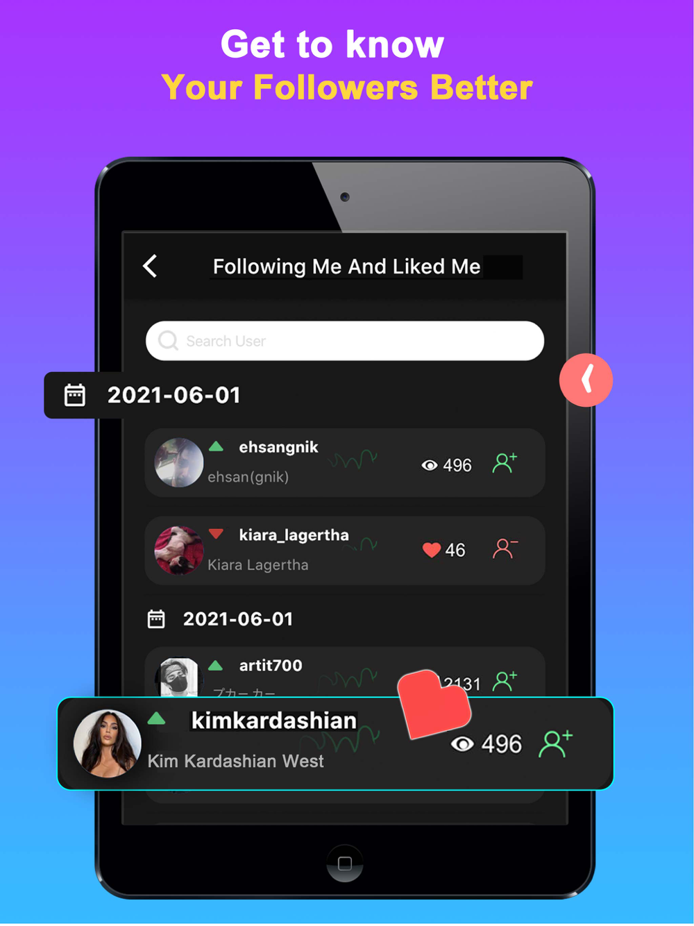 Track followers and unfollowers, likes and unlikes: Tracker for IG Likes&Followers is a tool to undercover the secrets behind the numbers of your Instagram likes and followers. It gives you deep insight analysis of your account. You can view the growth trends of your account and track the data change everyday.