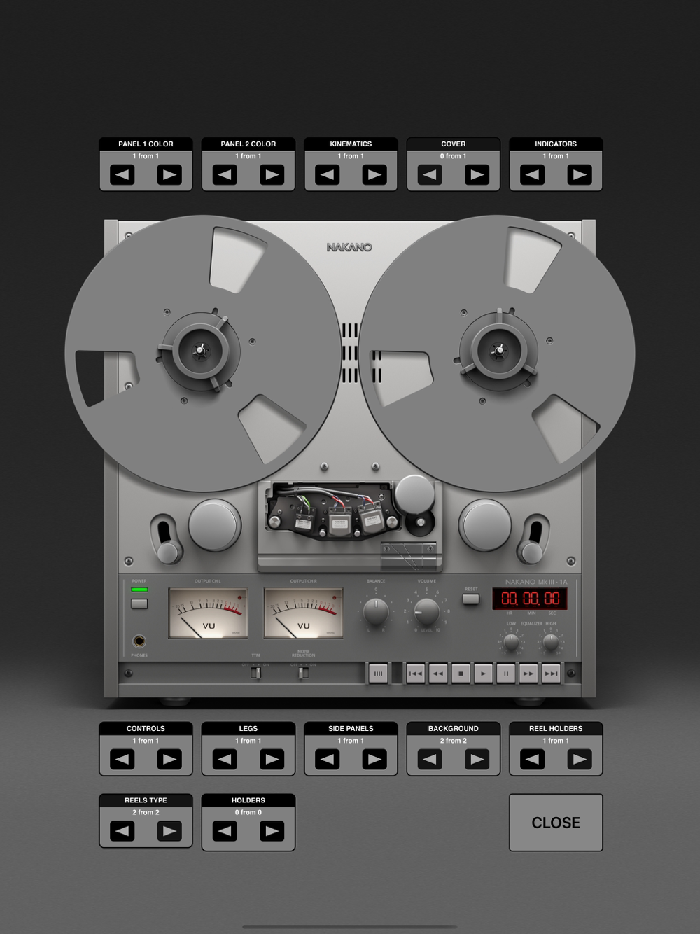 This is a realistic reel-to-reel tape deck simulator for iPad and iPhone with the ability to play local iTunes tracks as well as customize the colors of panels, buttons, and backgrounds using in-app components.