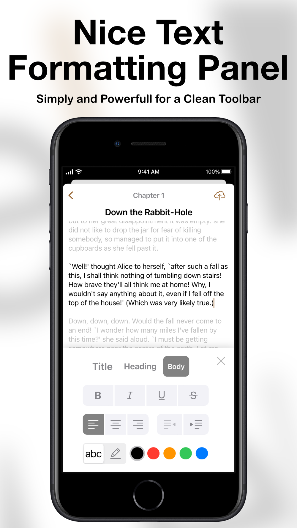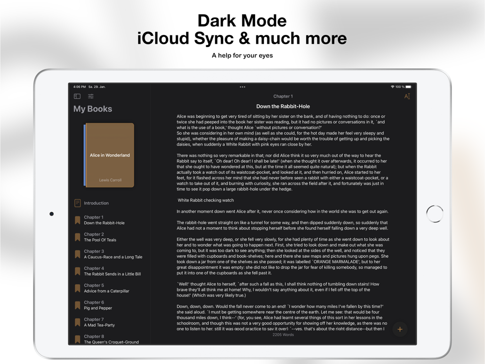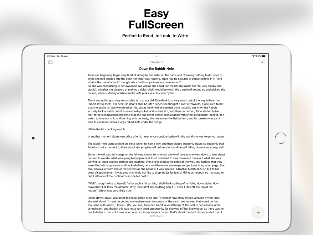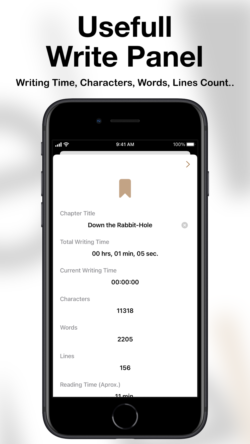 • Unlimited chapters, with character count, paragraphs, lines, words, writing time and reading time.
