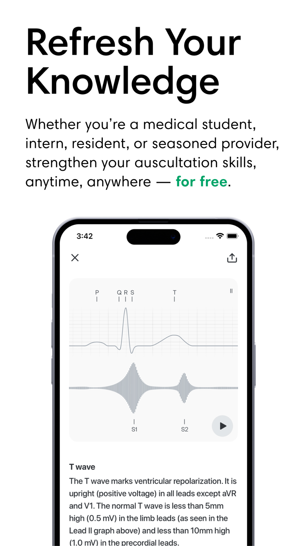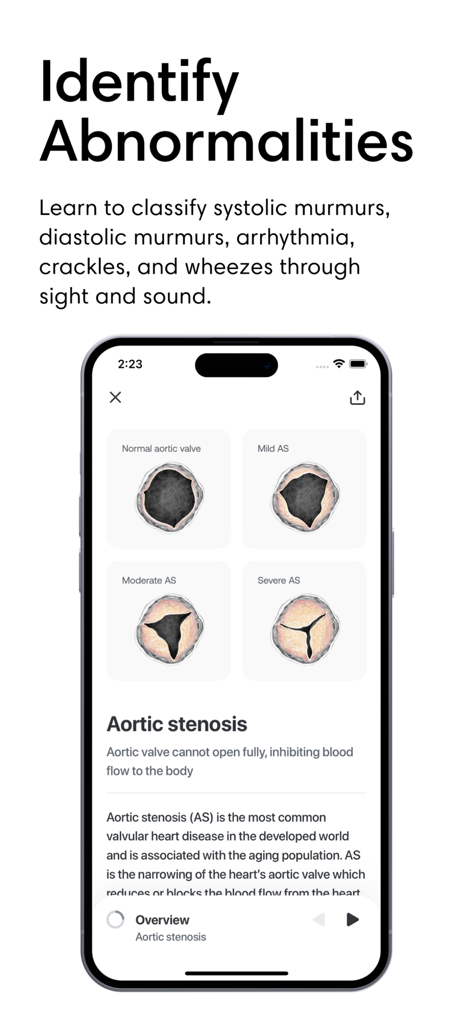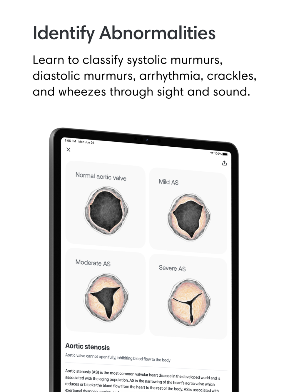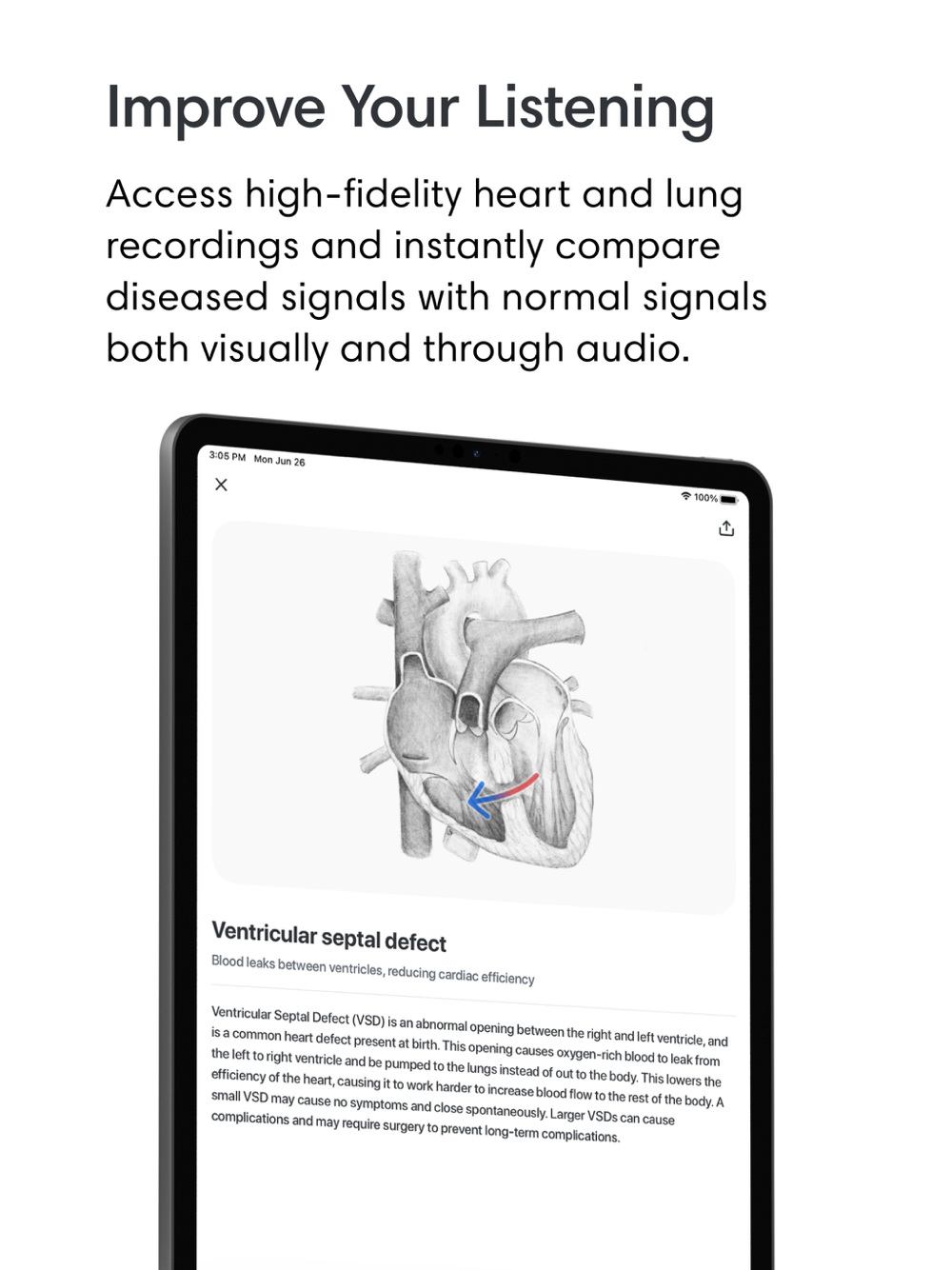 Learn using high-quality medical illustrations, hear high-fidelity heart and lung recordings, and instantly compare diseased signals with normal signals — both visually and through audio.
