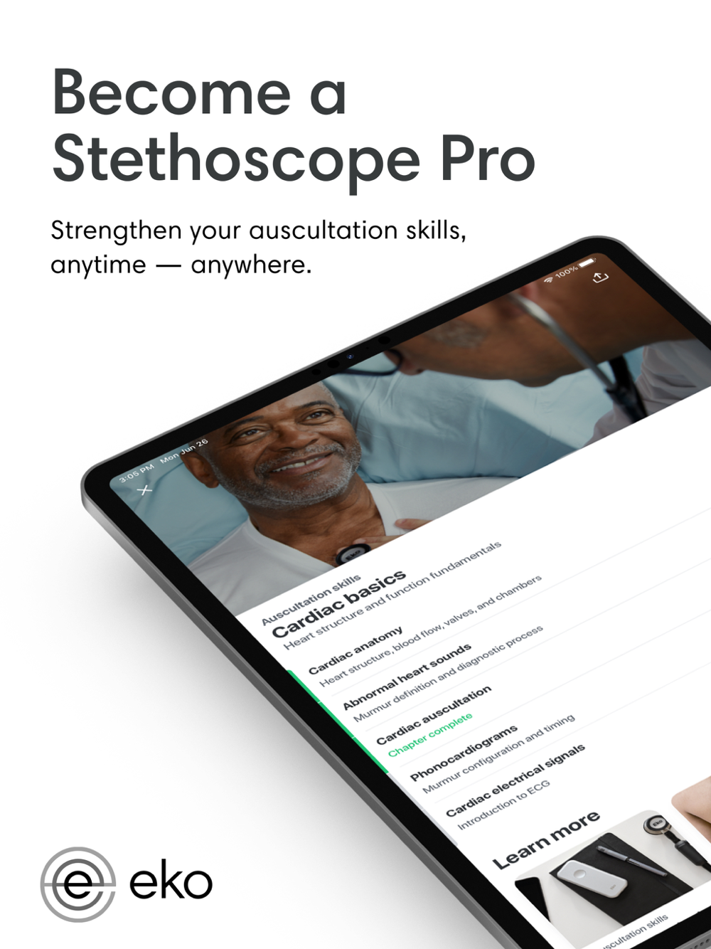 Whether you’re a medical student, intern, resident, fellow, attending, doctor, nurse, PA, EMT, or anyone who wants to learn — Eko Academy is available to you, for free.