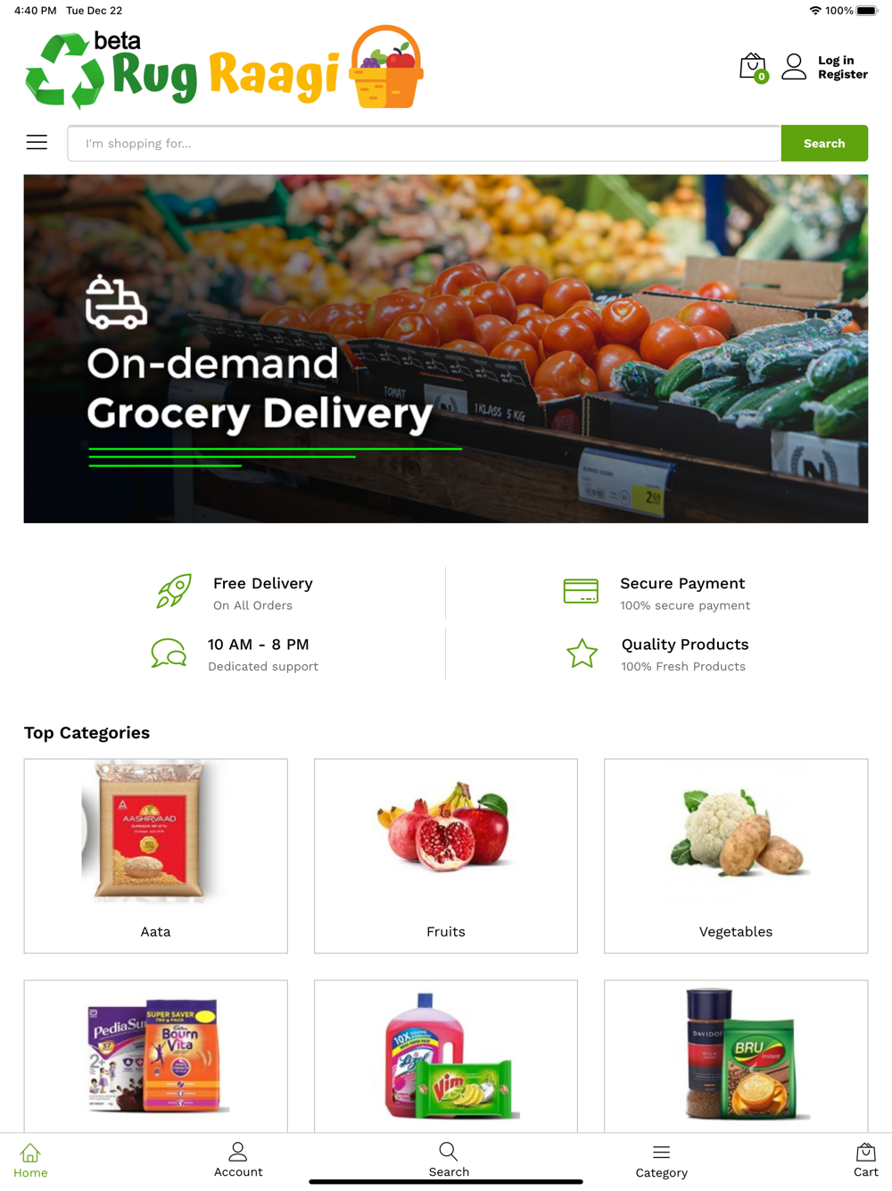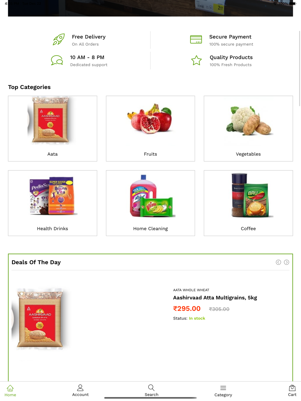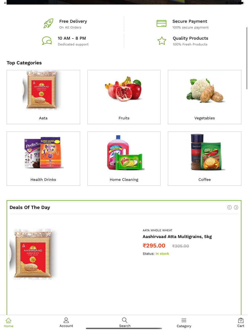 • Wide range of products, including fresh fruits and vegetables at your doorstep. Apart from flat discounts and offer on grocery items we also have the option to purchase your home essential goods at no cost.