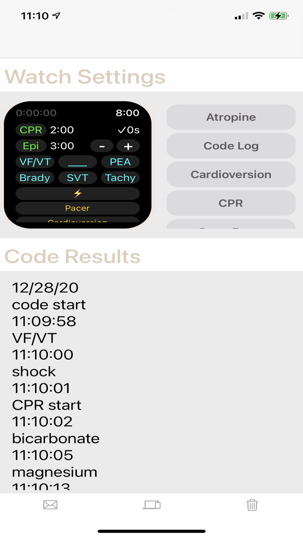 Customize your watch app based on your code role. Whether the code recorder, pharmacist, nurse, or other member of the code response team, choose what to see and track. Watch features include code timer, CPR cycles (2:00 CPR timer plus pulse check timer), medications, rhythms, shock delivered, pacer, cardioversion, free text event entry, free text dose entry, real-time code logging, and haptic feedback. Epinephrine and atropine intervals are adjustable. Upon pressing the "stop code" button, code results are synced to the paired device where code logs can be edited and exported. This app supports complications for quick access on the watch face.
