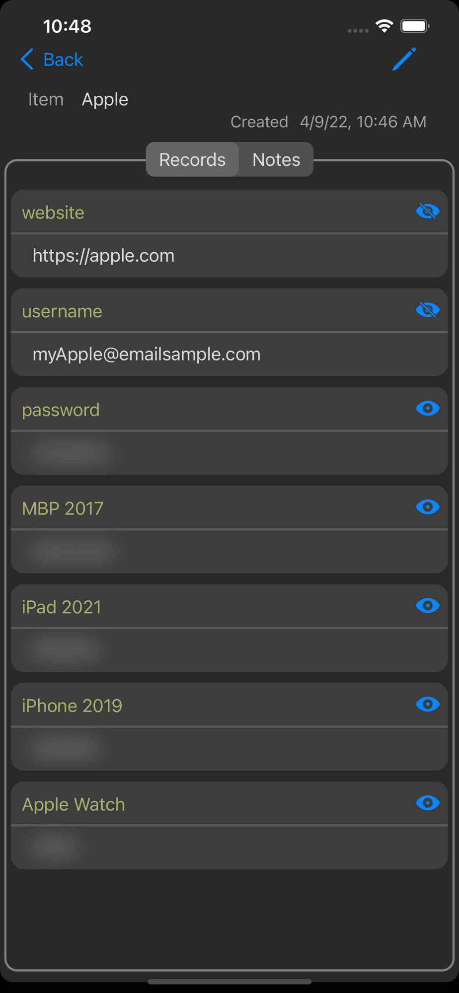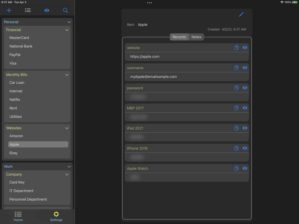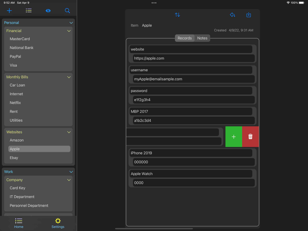 · Items contain your detailed information such as user names, passwords, and account numbers in its records and notes.