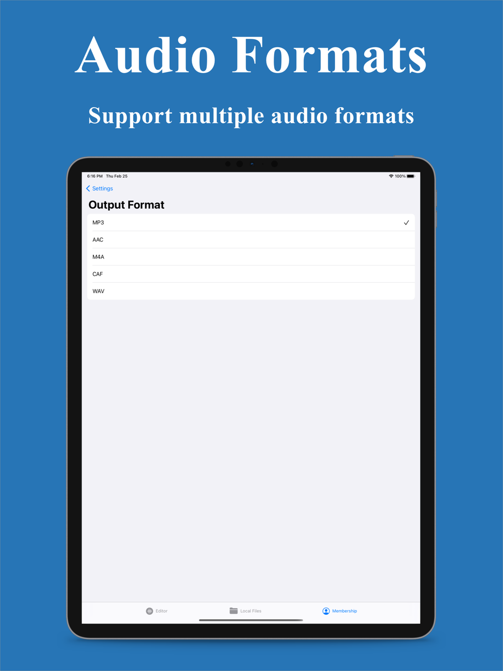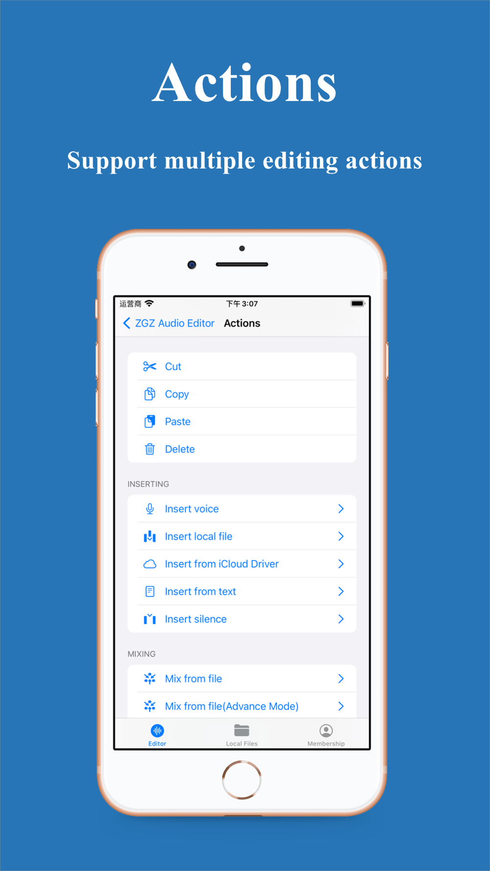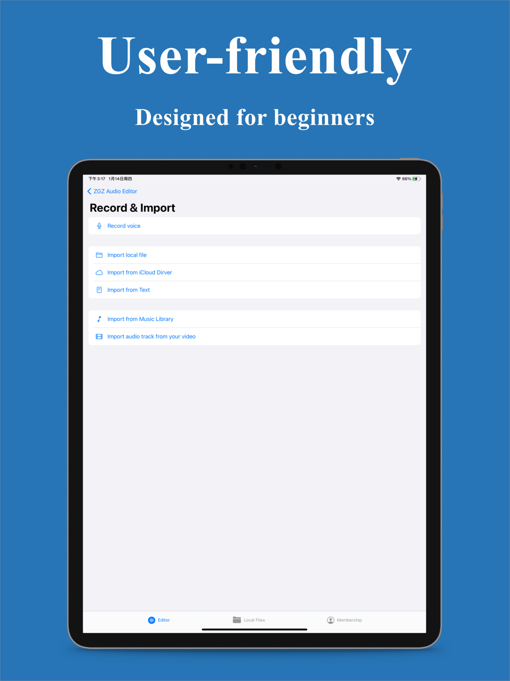 ZGZ Audio Editor is a powerful but easy-to-use audio editing tool. ZGZ Audio Editor supports a number of file formats including MP3, AAC, M4A, CAF and WAV.