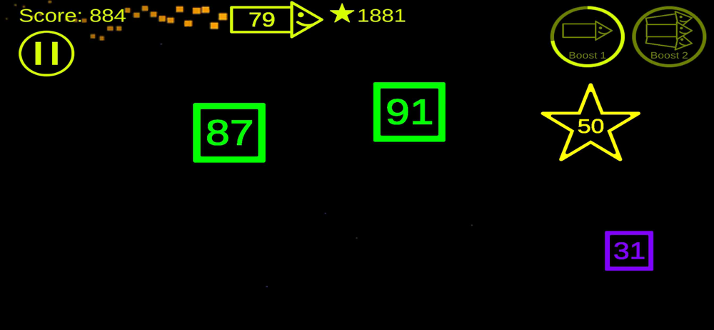 The player moves a rocket through the universe. The aim is to smash all the blocks where the number of points is less. If the player smashes a block, his number of points increases and he gets stars. The rocket can shoot bullets to damage the blocks. If a block is larger in number than the rocket and collides with the rocket, the rocket is destroyed and the game is over.