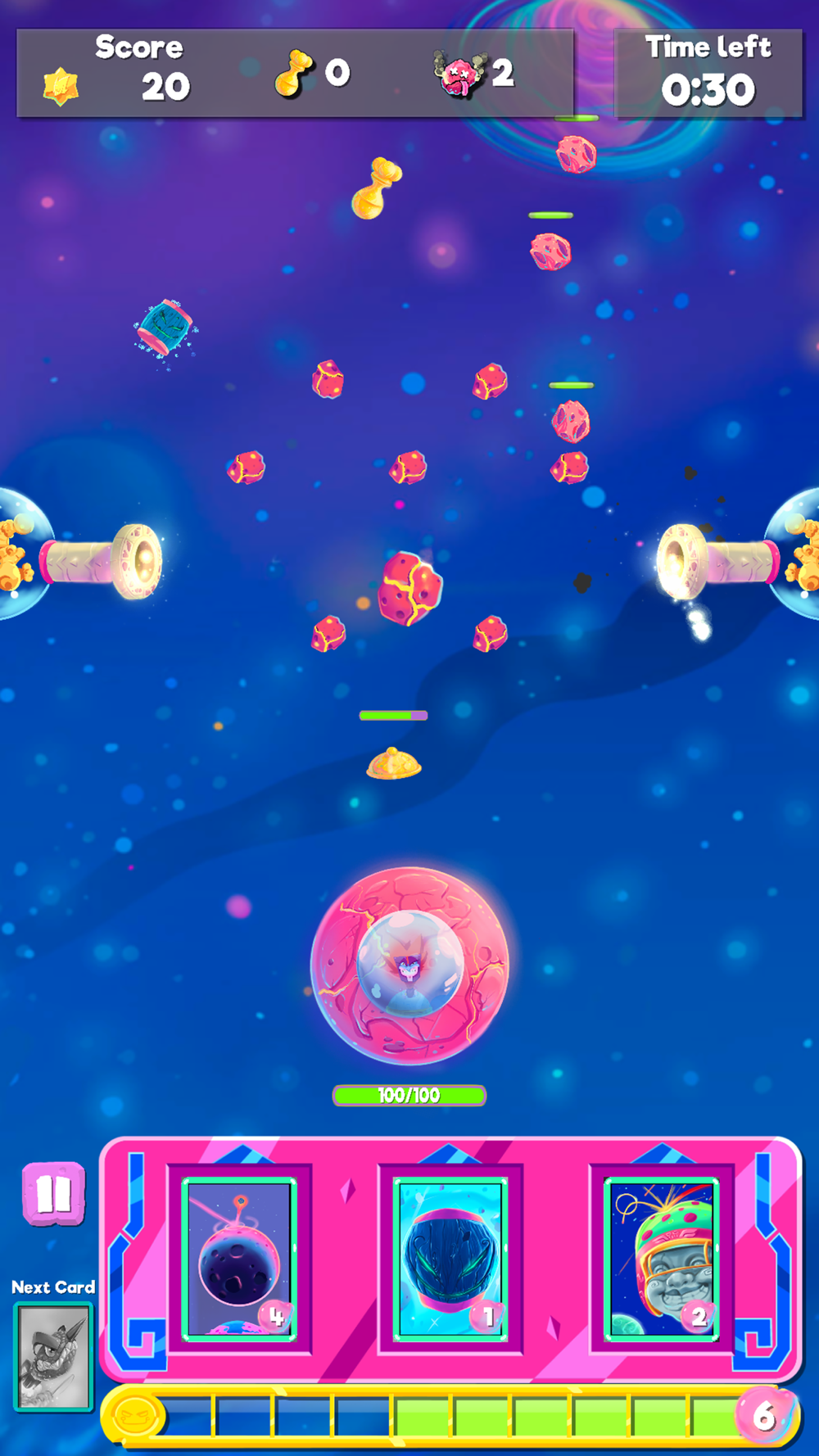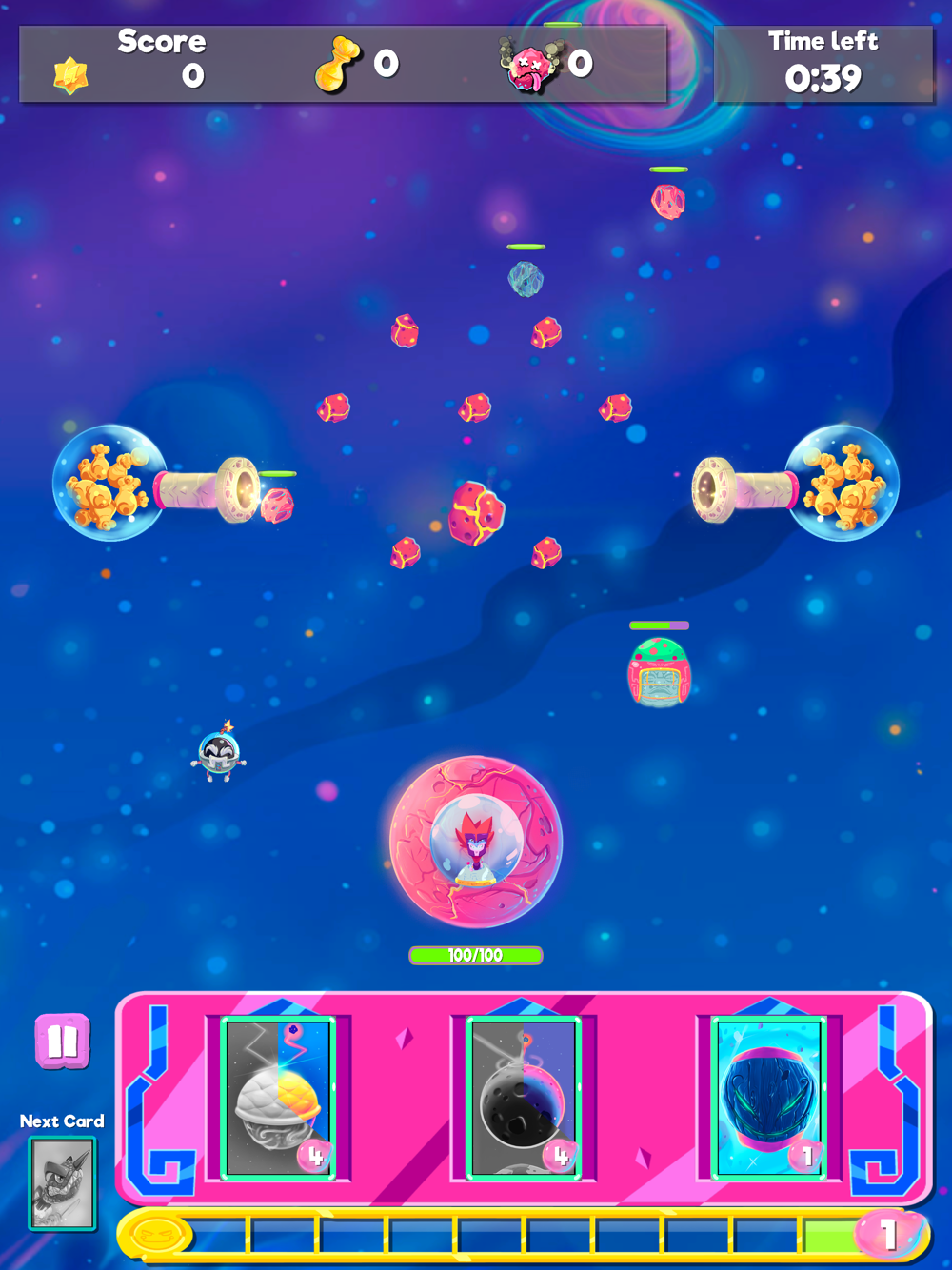 Utiliza tus mejores cartas para planificar una estrategia que te permita a ti y a tu planeta sobrevivir durante muchos años. Durante una partida, recibirás constantes ataques de asteroides enemigos los cuales puedes destruir utilizando tus cartas.
