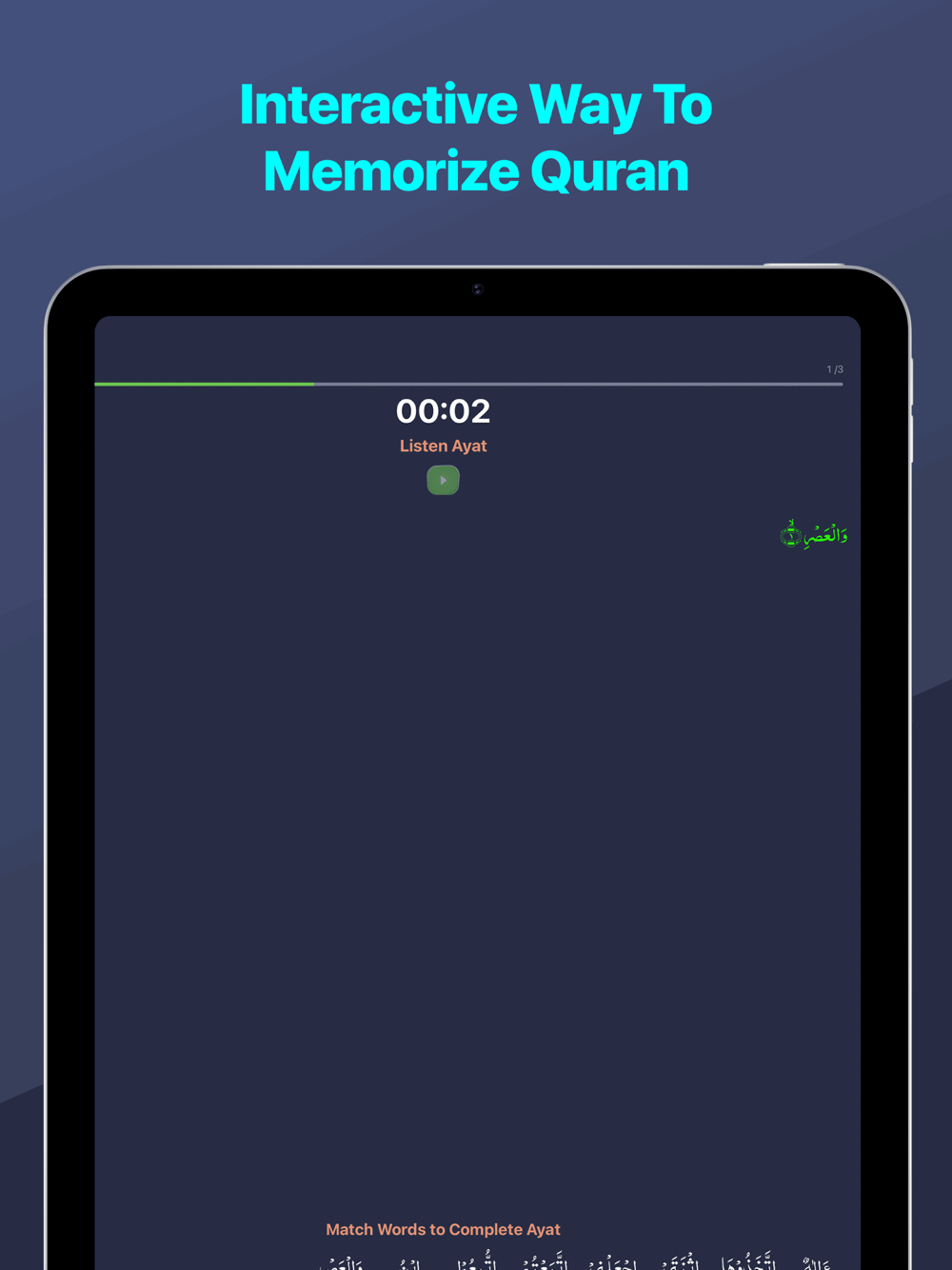 4. While Playing the audio of Ayat / Quranic Verse, miscellaneous words will appear at the bottom for you to choose and select.