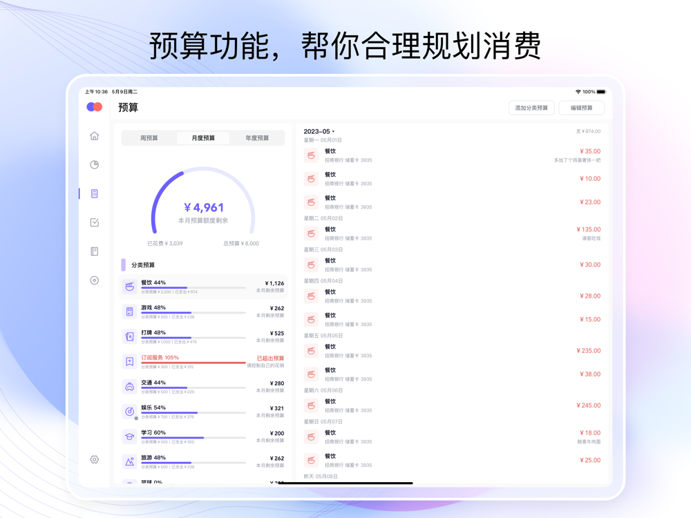 - 预算管理:支持设置月度预算,监控消费,合理规划自己的财务;