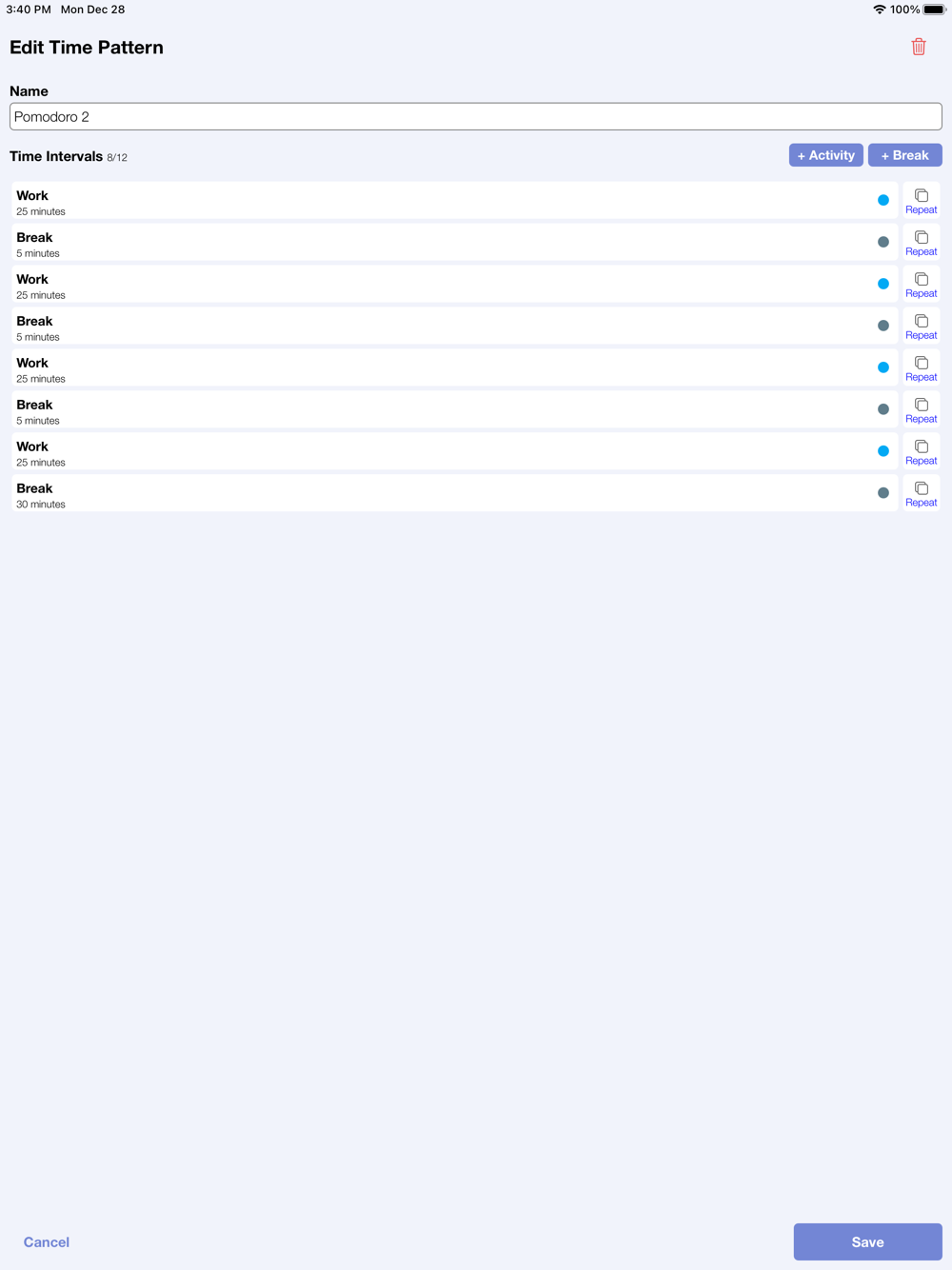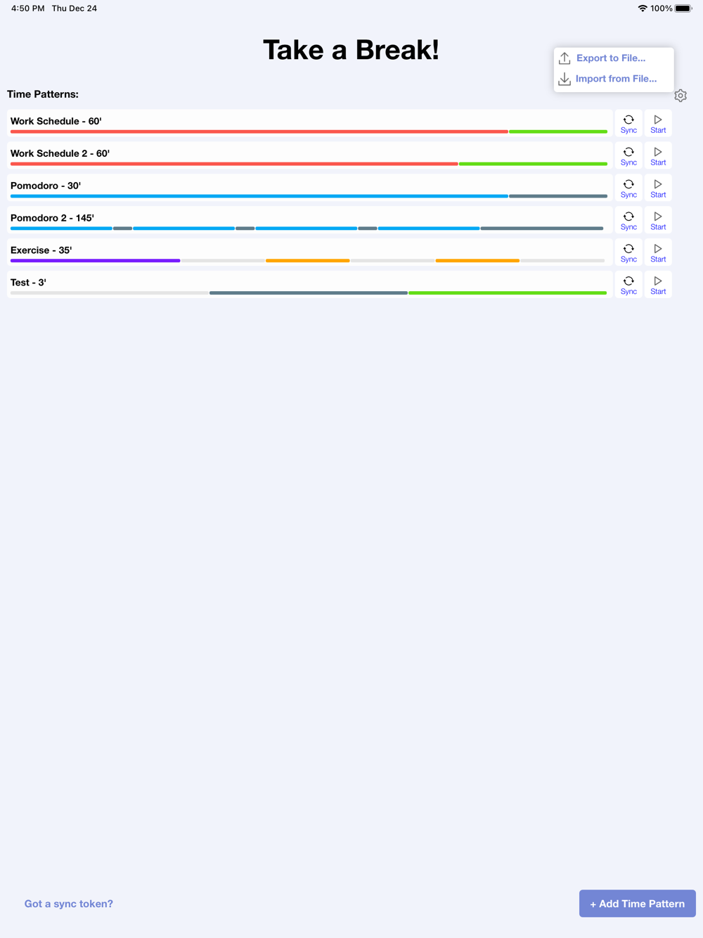 With Take a (sync) Break you can create custom work-break time patterns and be notified whenever it's time to take a break or resume work.