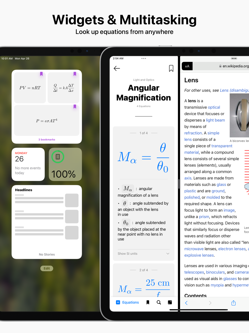 Photronium comes with over 360 physics equations, Intelligent Search, Symbol Search, Widgets, Bookmarks, Suggested Websites, and Dark Mode all available for free and ad-free. With Extras, you can purchase more features and support the app’s development.