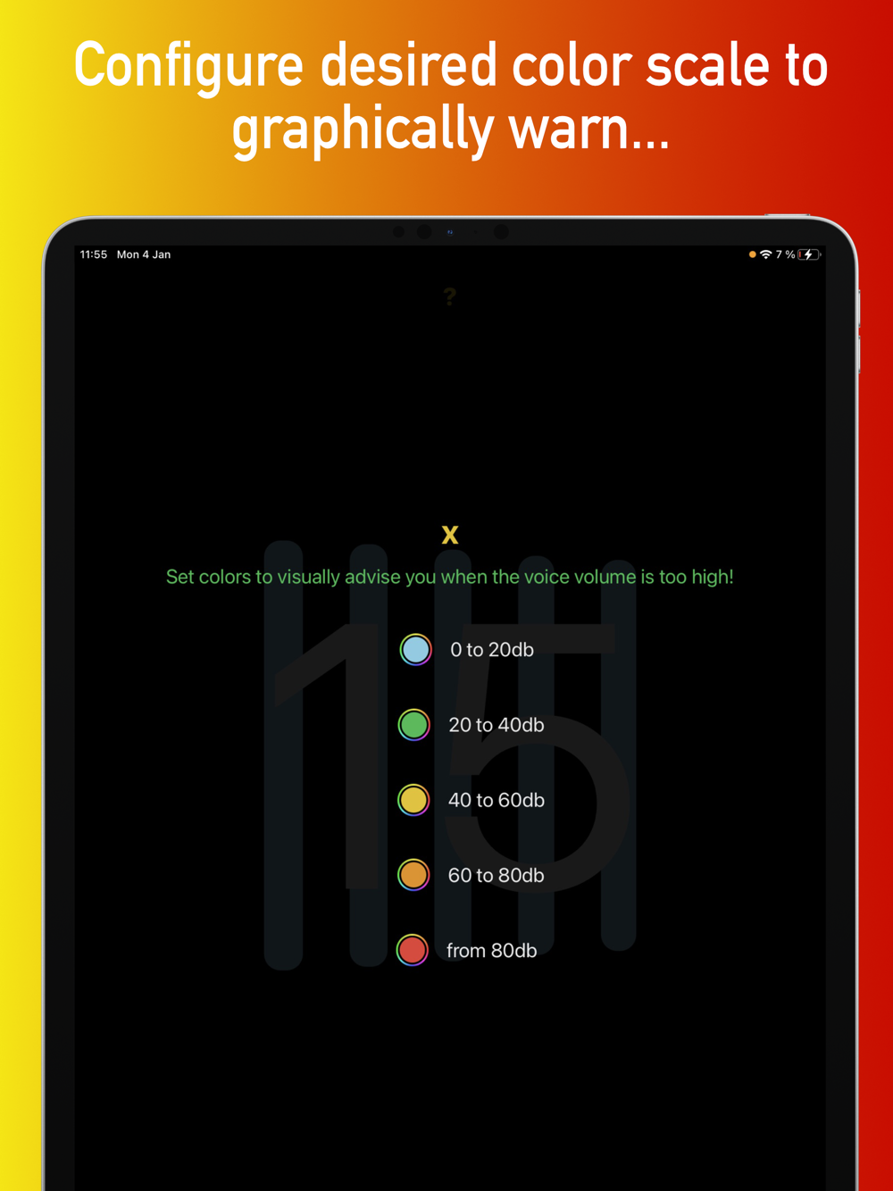 Colours will advise you when people voice volume is too high. The app will show decibel meter of your group voices and will graphically increase in size and color of the bars to show when to reduce voice volume.