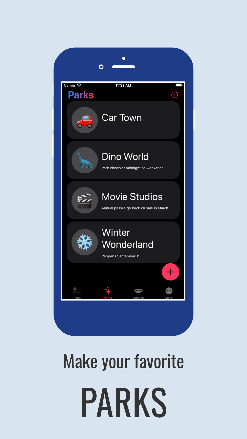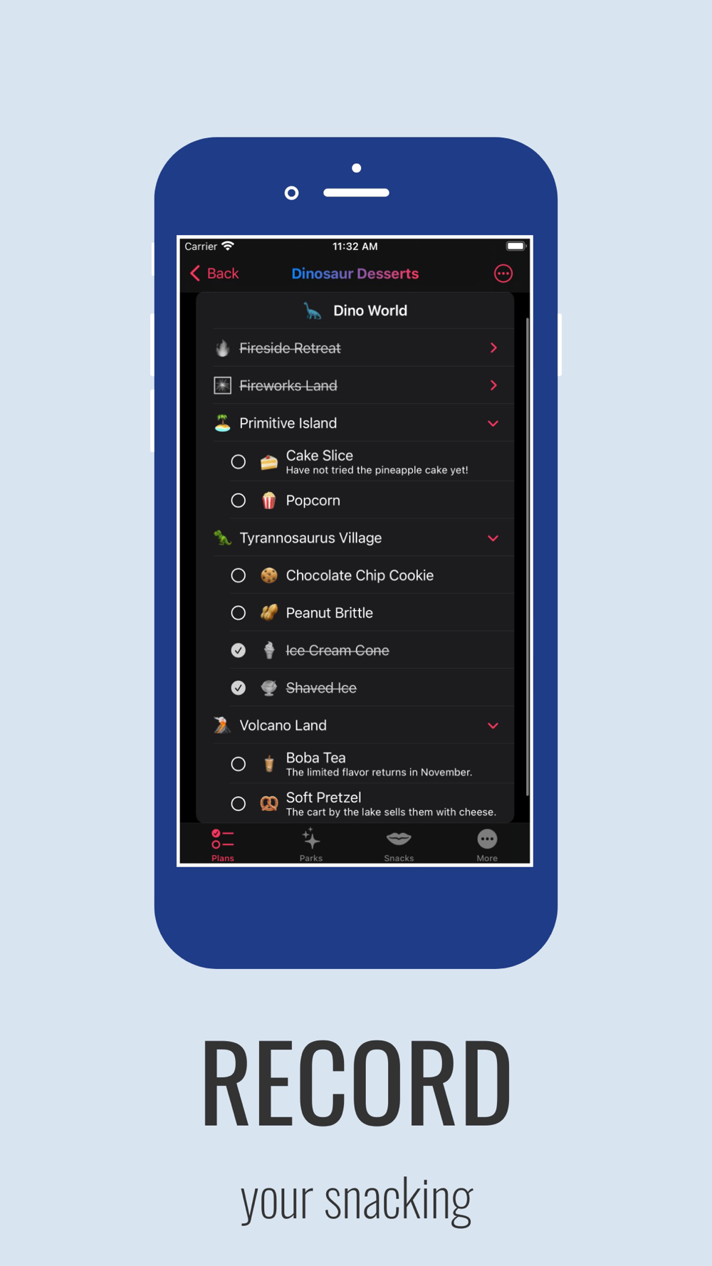 Snack Plan is your handy helper for keeping track of your theme park snacking! When you’re someone that goes to theme parks frequently many of the visits can become centered around food. Snack Plan lets you compile lists of your favorite snacks and parks, which you then use to create your snacking plans. Mark which snacks you’ve eaten as the day progresses and you’ll also have a record of which ones you didn’t get to.