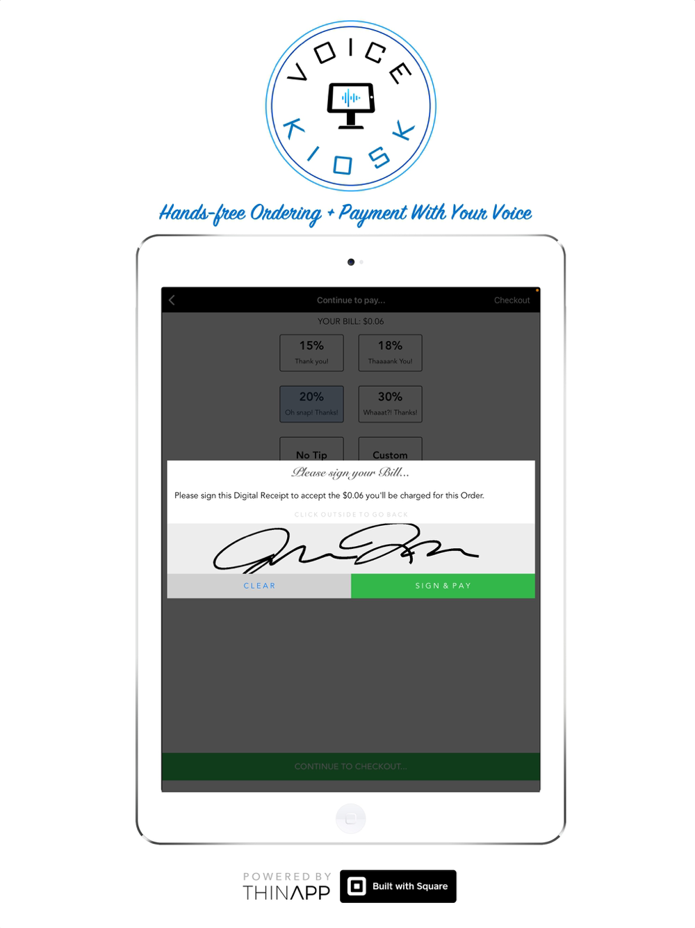 Voice Kiosk - is a voice-activated ordering kiosk that lets any business sign up and start selling from an iPad or iPhone Kiosk within minutes. And, if you use Square, it will pull your entire Item Library (ie. products, services or menu items) instantly.
