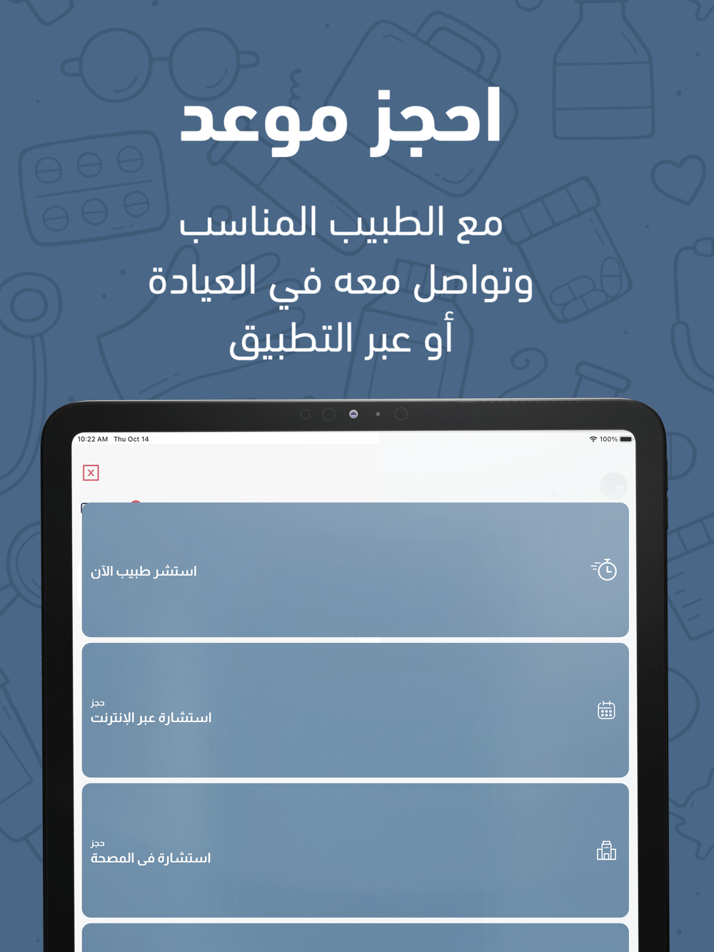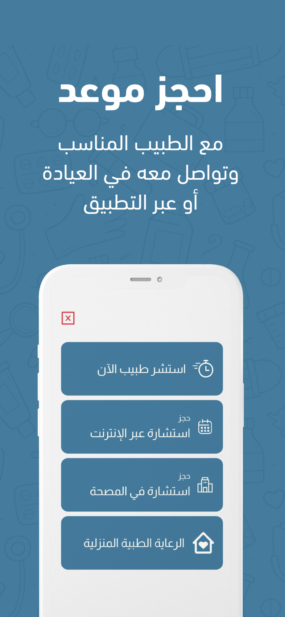 يوفّر لك التطبيق أيضًا إمكانيّة حجز موعد لدى أحد الأطبّاء في إحدى المصحّات الموجودة في ليبيا، حيث سيوفّر عليك ذلك عناء الوقوف في طوابير الانتظار الطويلة ومخالطة أعداد كبيرة من الناس، مما سيقلل من احتمالية انتقال مختلف أنواع العدوى لك لا قدّر الله.