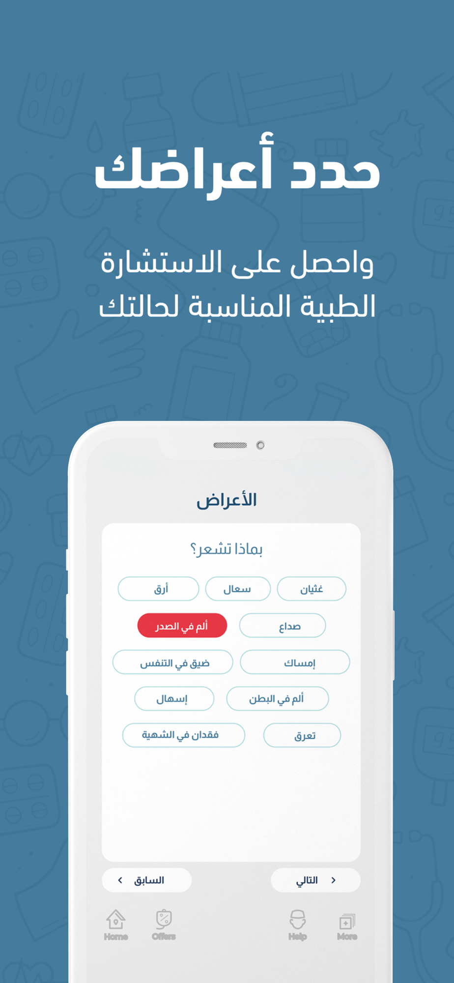 سيطلب منك التطبيق إدخال بعض الأعراض التي تعاني منها لمساعدة الطبيب المختصّ في تكوين صورة مبدئيّة عن حالتك.
