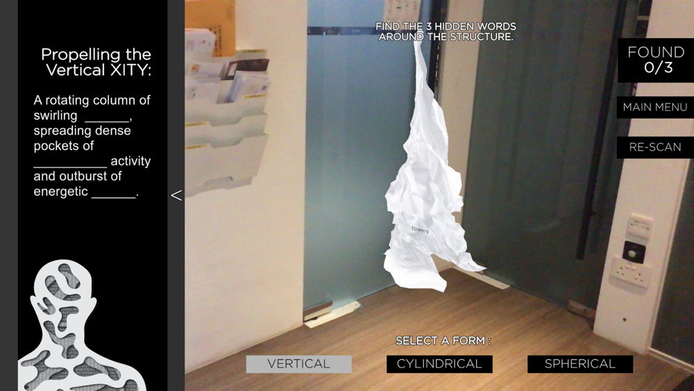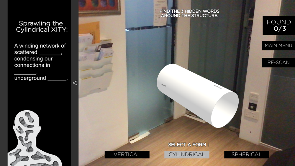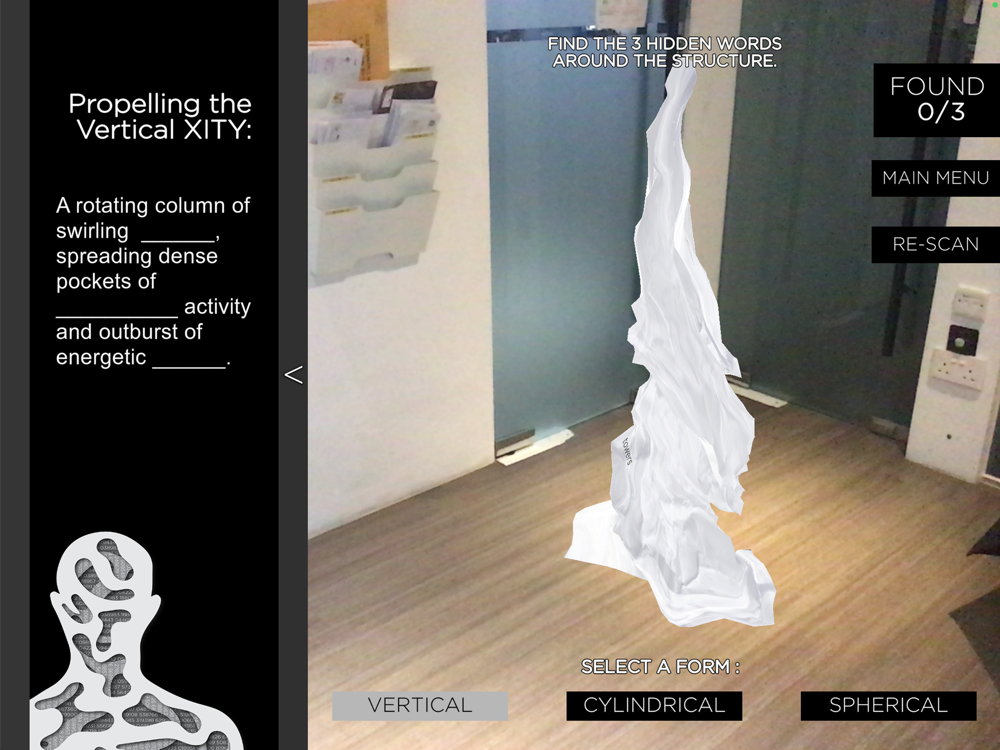 In this digital iteration, Matthew Goh teams up with VizioFly to create a minimalistic representation of XITY through an Augmented Reality application fusing movement, sound and visual animation. It comprises a 3D object with interactive points for viewers to participate in the self-discovery of the living environment through an audio geometry experience.
