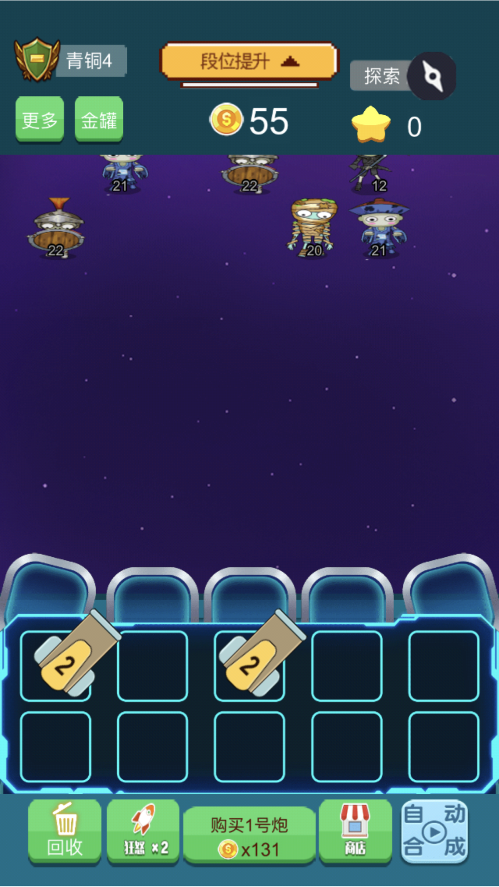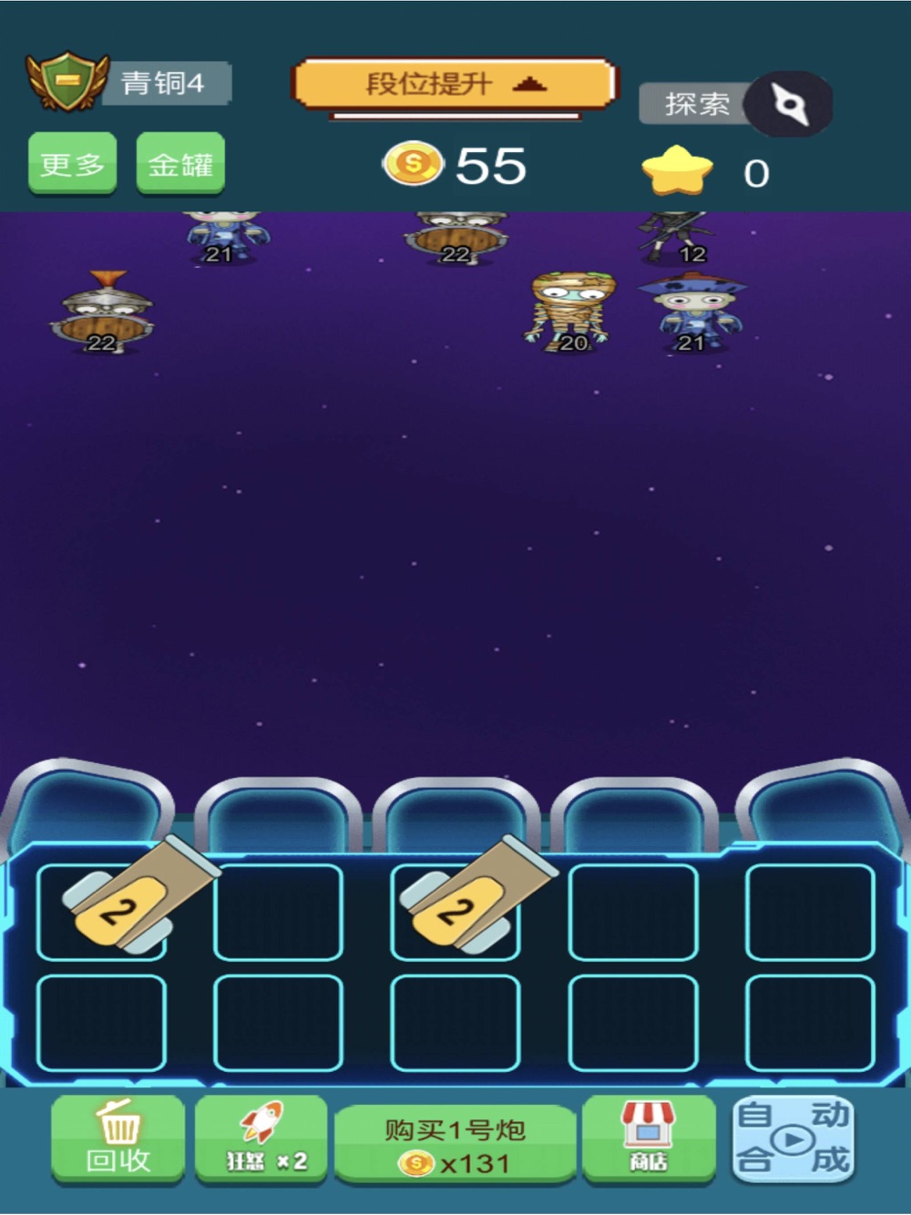 这是一款迷你塔防小游戏,通过购买机甲对敌人发动攻击,被击灭的敌人会散播大量金币,通过金币购买更多机甲,机甲可以合成升级,机甲等级越高,威力越大哦,获得的金币越高哦!
