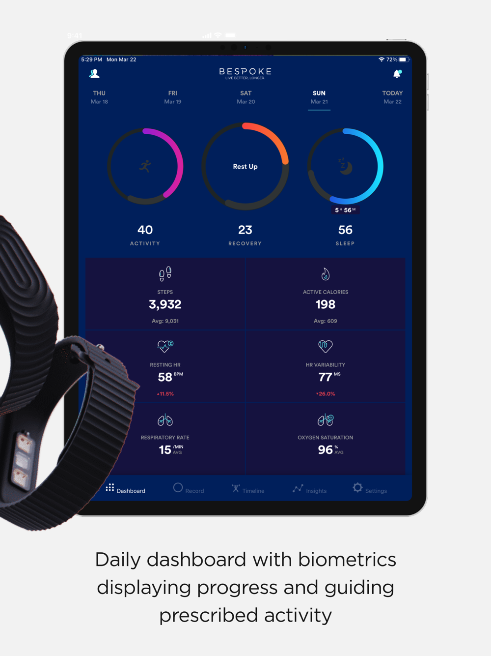 Bespoke Health is a wearable health analytics platform designed to learn about you and help make impactful, data-driven decision about your health.