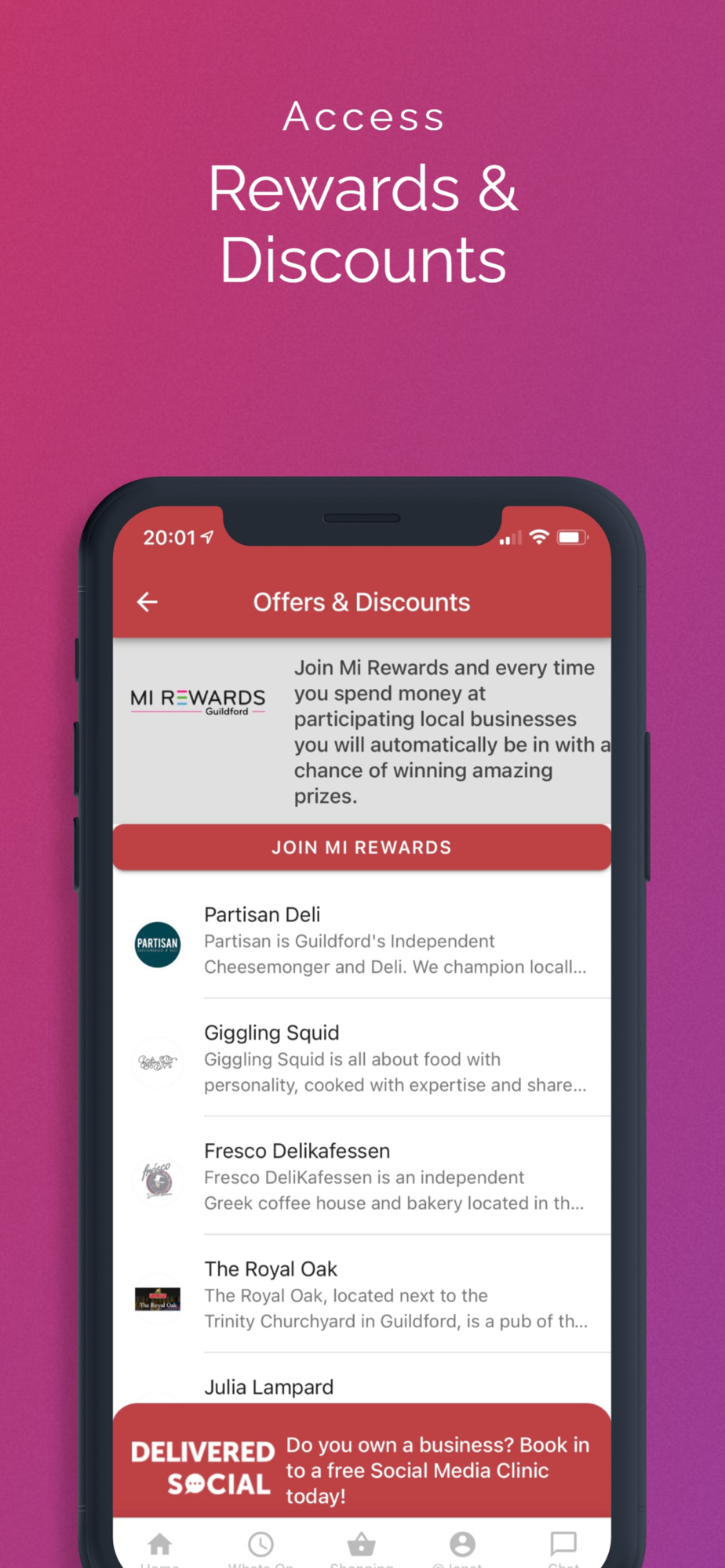 The team at Delivered Social created The Guildford App to empower the business community with a zero-cost initiative whilst also giving the locals a place to chat, shop, and experience everything that Guildford has to offer.