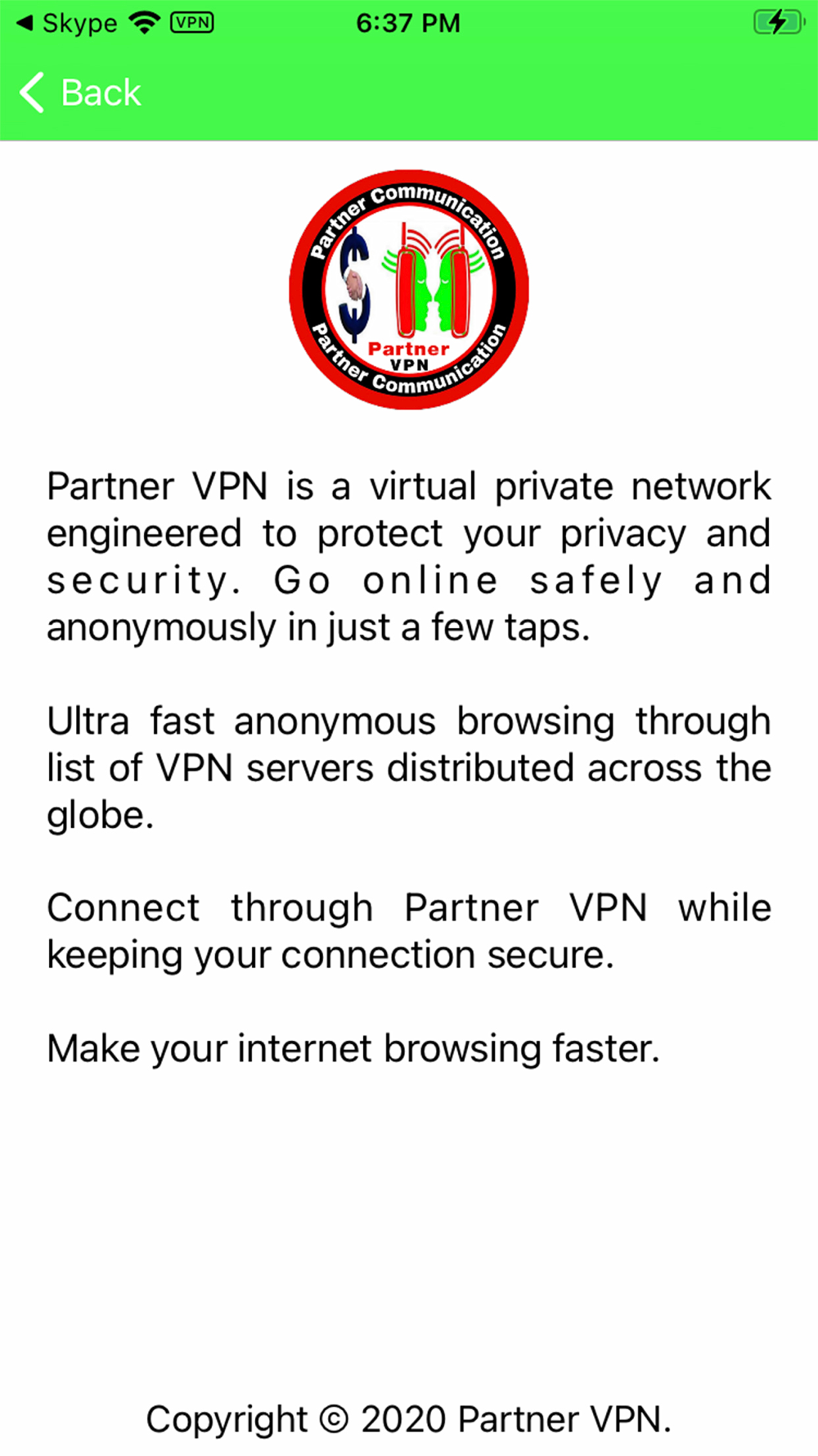 Partner VPN is a virtual private network engineered to protect your privacy and security. Go online safely and anonymously in just a few taps.