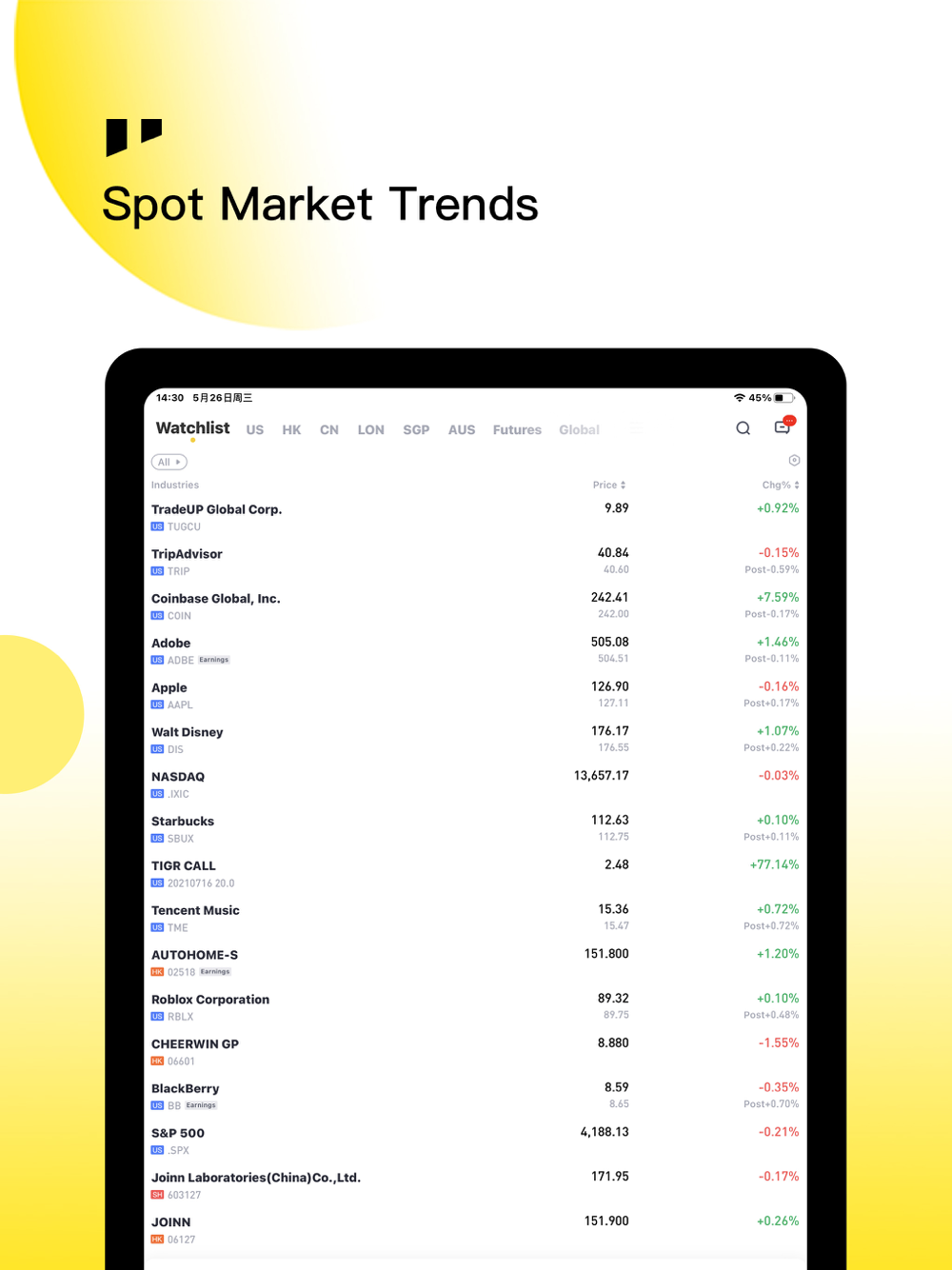 Streaming Market Data: enjoy free real-time streaming data for U.S., H.K., Singapore, and A-share stocks with no delay.