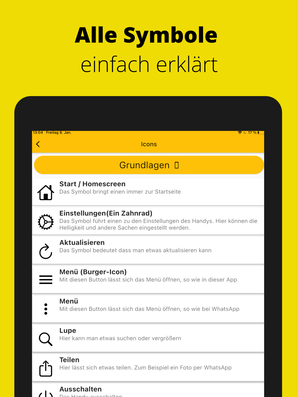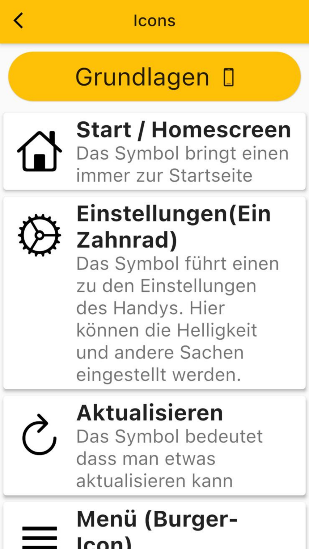 Senioren mit Smartphone ermöglicht Senioren oder Menschen, die mehr über das Smartphone wissen möchten, viele neue Dinge zu lernen. Die App ermöglicht das erlernen von den wichtigsten Symbolen(Icons), WhatsApp, Steuerungen, Internet und vieles mehr.