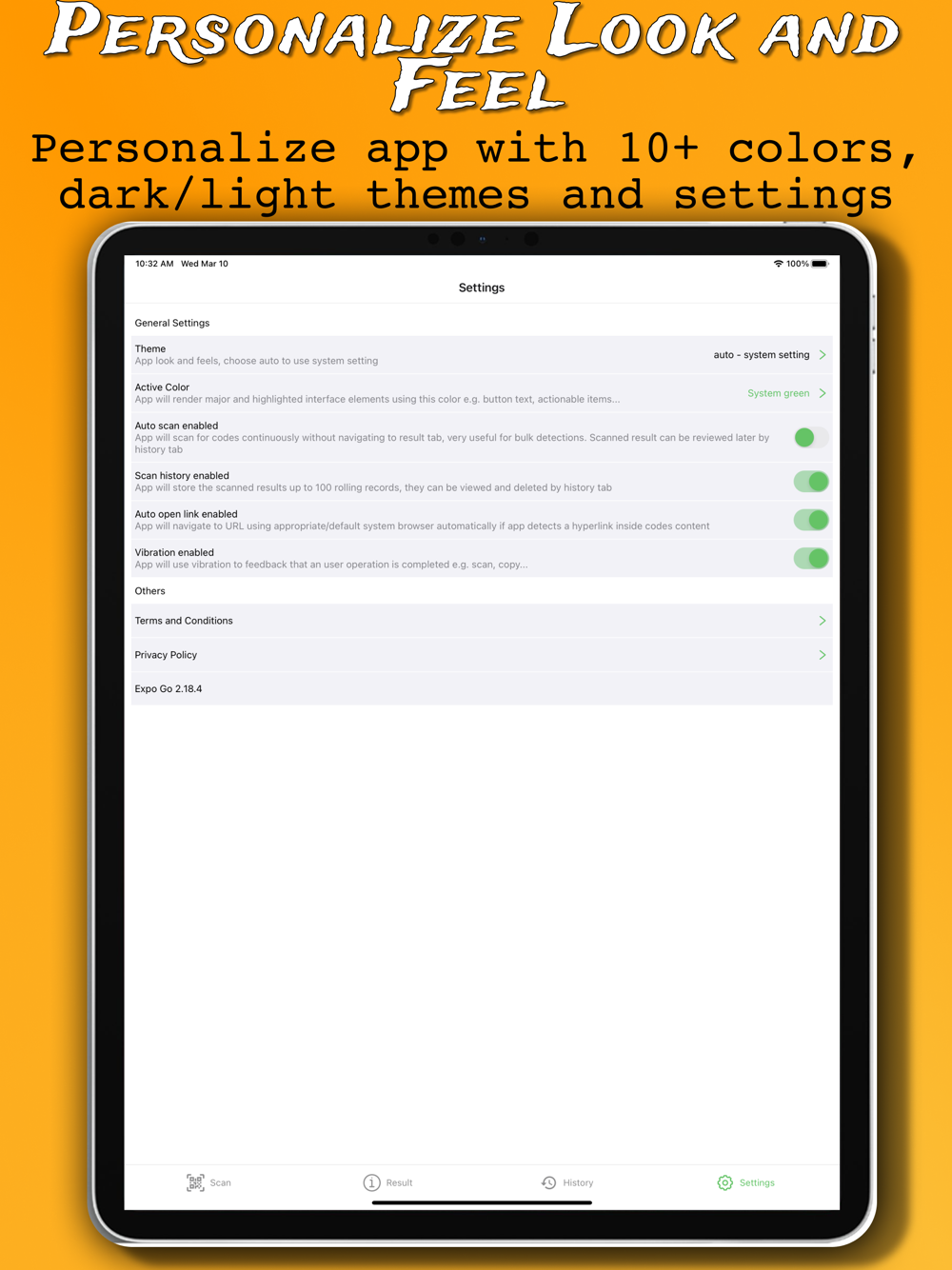 -> Scan up to 18 types of QR-Code, Barcode, Datamatrix, Code128, Code39, EAN-8, EAN-13, wifi, contact, product, URL, ISBN and much more.